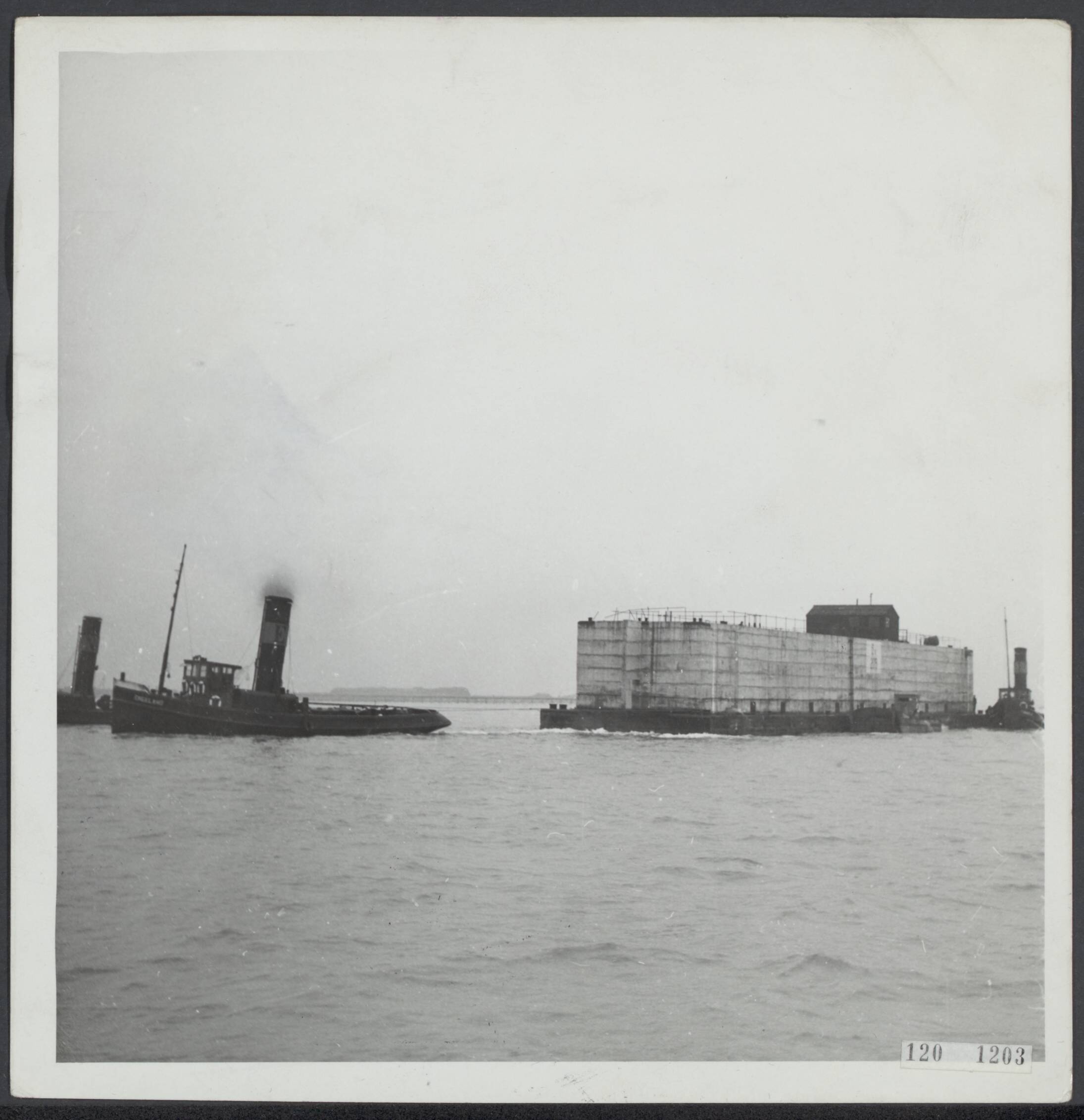 Herstelwerkzaamheden Walcheren. Caissons voor het dichten van het dijkgat bij Rammekens worden gesleept