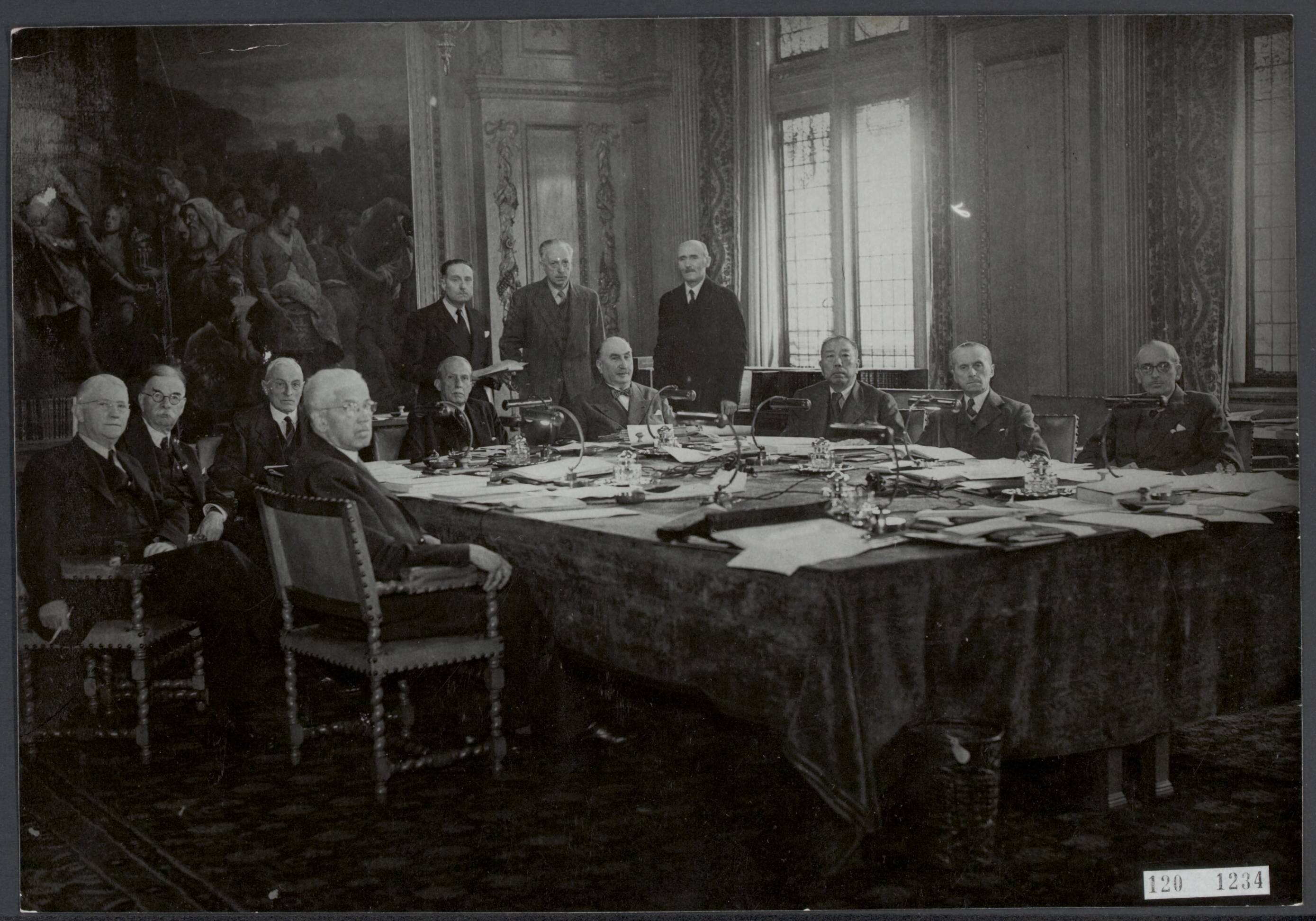 Zitting Permanent Hof van Internationale Justitie Vlnr. Hudson (USA), Jhr Eysinga (Holland) Sir Cecil Hurst (Engeland), Erich (Finland), Guerrero (San Salvador, president), Negulesco (Roemenie, ), Cheng (China), de Visser ( Belgie), Olivan (Spanje) leden van het Internationaal Hof voor Justitie. Staande de drie secretarissen.