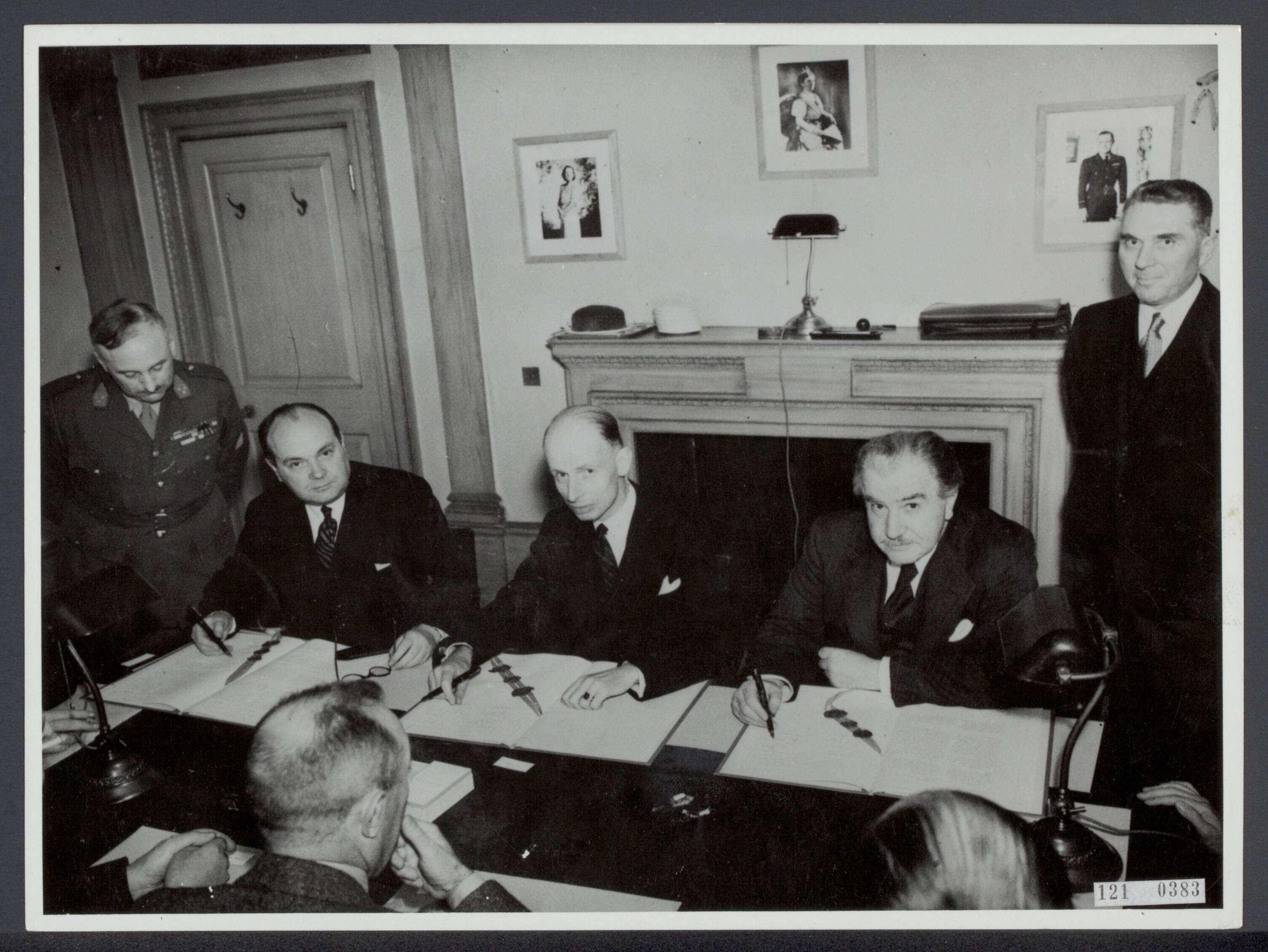 Ondertekening in Londen van een overeenkomst tussen België, Luxemburg en Nederland betreffende vaste wisselkoersen. Vlnr M. Spaak (België), Van Kleffens (Nederland) en M. Bech (Luxemburg)