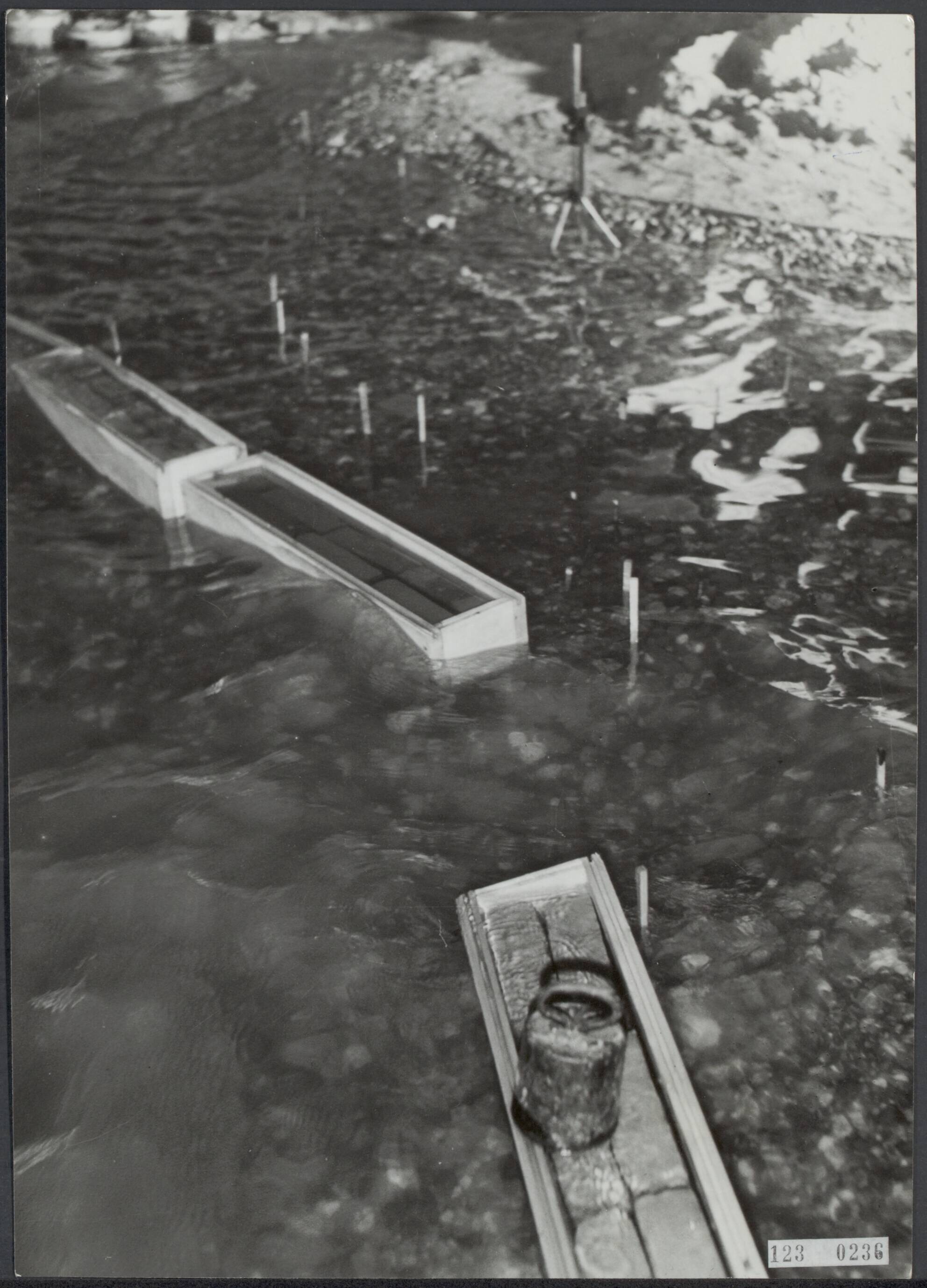 Waterloopkundig Laboratorium te Delft. Golven breken op de golfbrekers in de Nolledijk, het eerste gedichte gat