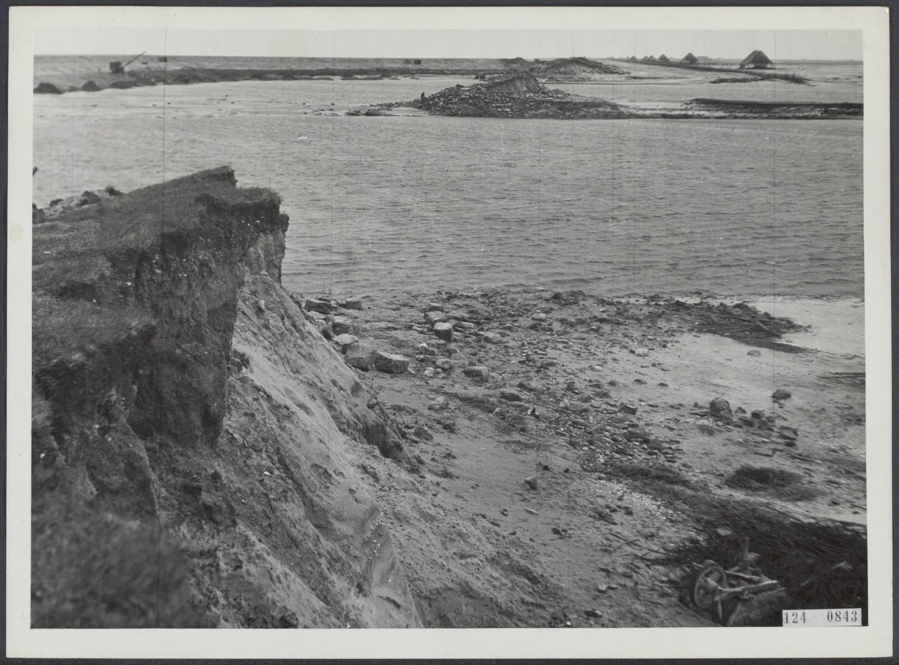 Wieringermeerpolder. Een van de gaten in de dijk gemaakt door de Duitsers in april 1945. Het tweede gat is zichtbaar in de verte