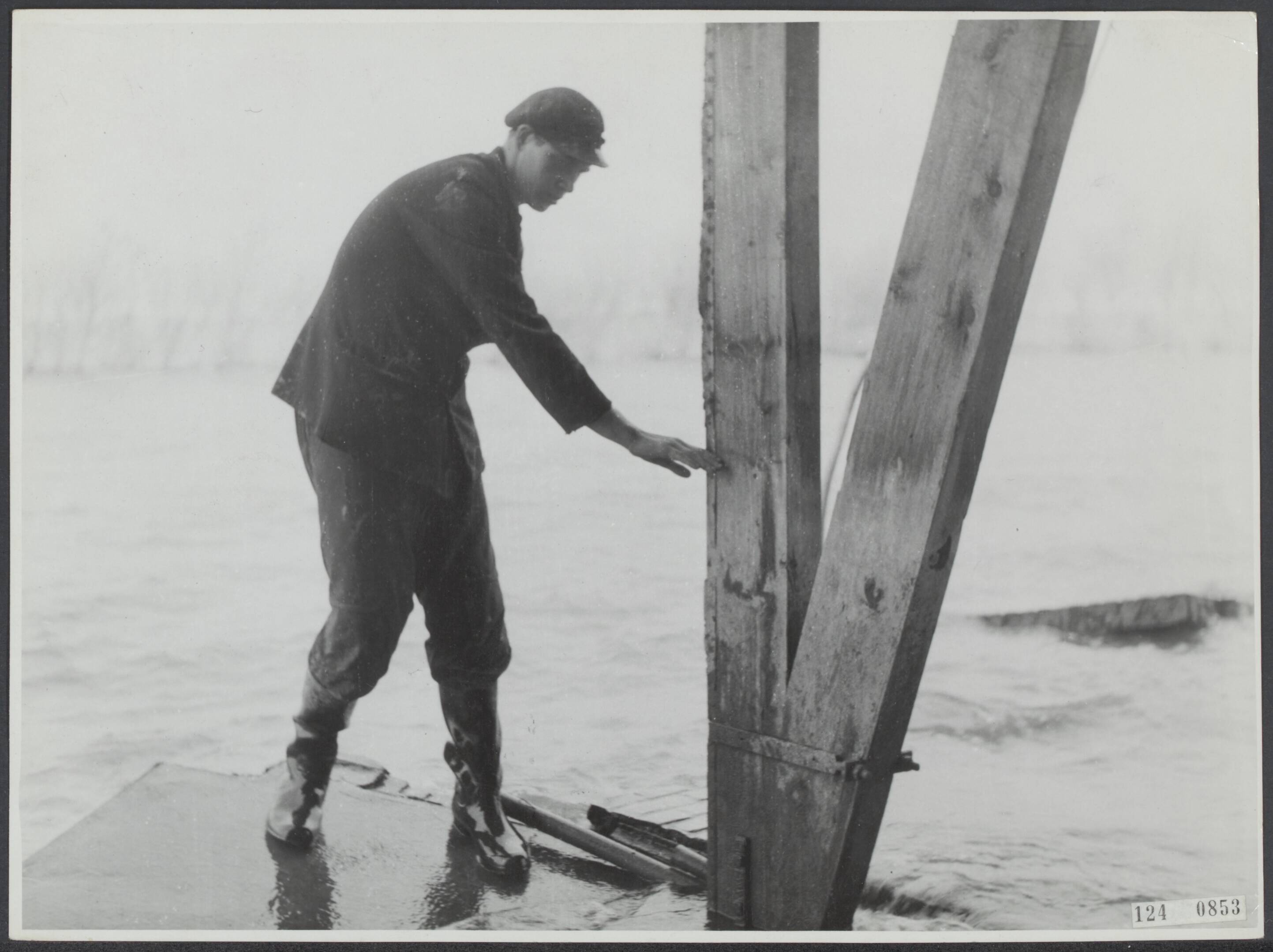 Drooglegging van de Wieringermeerpolder. Jonge man geeft aan hoe hoog het water in een ondergelopen boerderij heeft gestaan