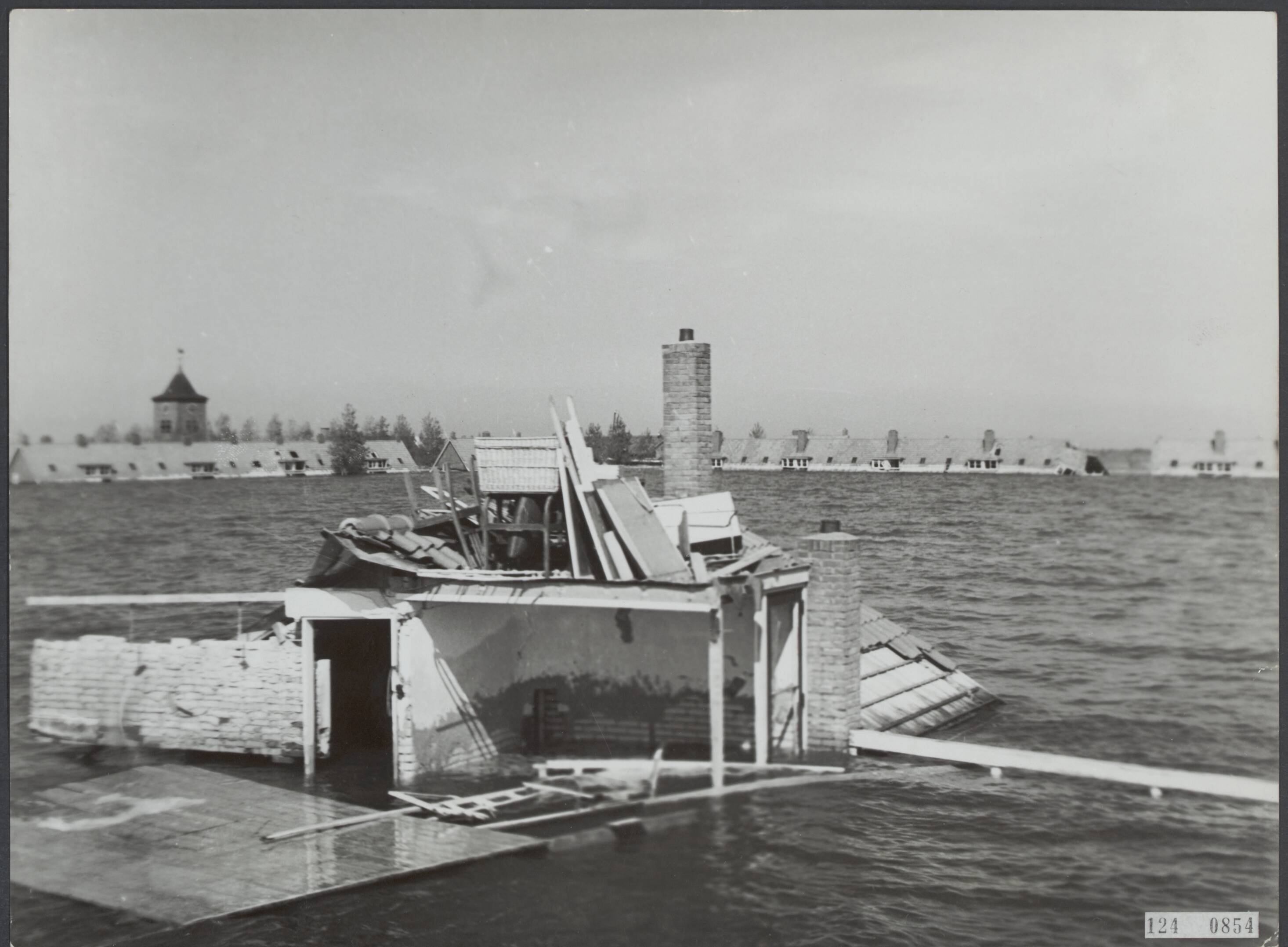 De Wieringermeer onder water. Een der huizen, welke onder water hebben gestaand en waarvan het bovengedeelte is weggeslagen