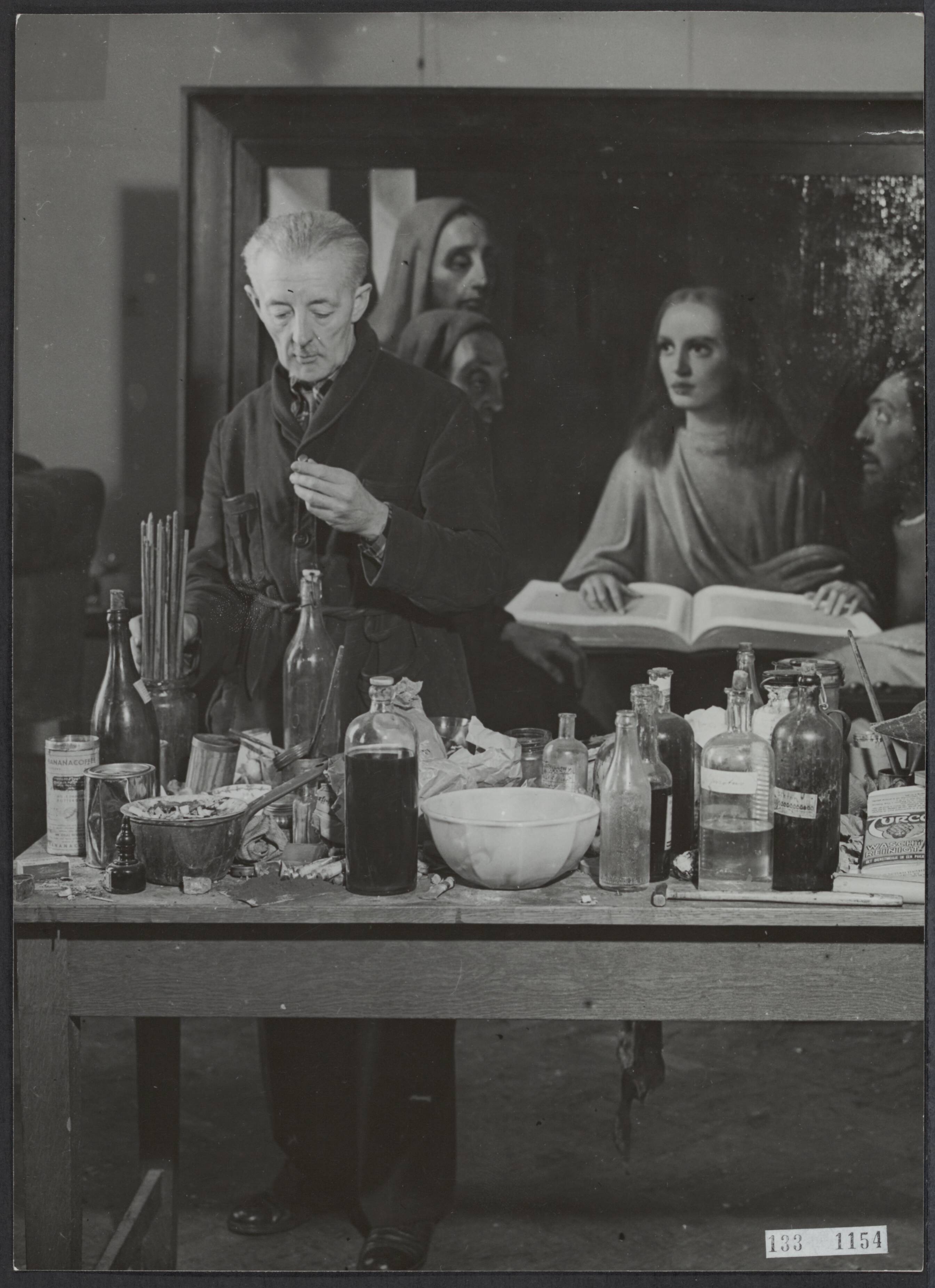 Han van Meegeren in zijn atelier werkend aan het schilderij 'Jezus en de Schriftgeleerden' dat hij maakte om aan te tonen dat hij de schilder was van 'De Emmaüsgangers' dat gehouden werd voor een werk van Johannes Vermeer van Delft