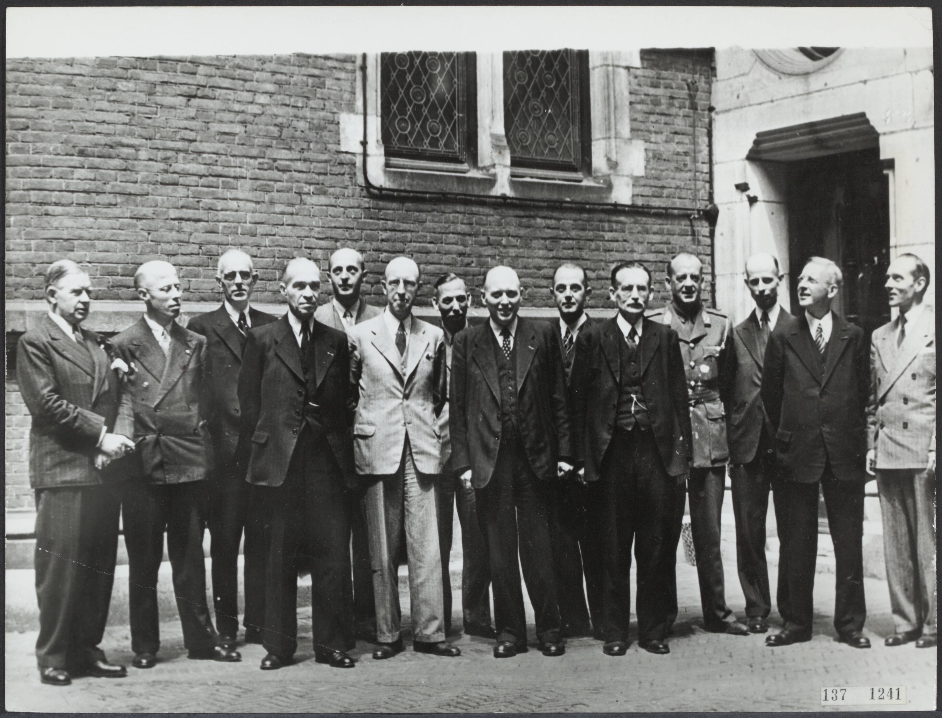 Kabinet Schermerhorn-Drees (24-6-1945 / 3-7-1946).Vlnr: J.M. de Booy (Marine), dr. L.J.M. Beel (Binnenlandse Zaken), Ir. Th.S.J.G.M. van Schaik (Verkeer en Energie), prof. dr. J.H.A. Logemann (Overzeese Gebiedsdelen), S.L. Mansholt (Voedselvoorziening, Landbouw en Visserij), prof. mr. P. Lieftinck (Financiën), ir. H. Vos (Handel en Nijverheid), prof. ir. W. Schermerhorn (minister-president, Algemene Oorlogsvoering), mr. H.A.M.T. Kolfschoten (Justitie), W. Drees (Sociale Zaken), mr. J. Meyen (Oorlog), mr. E.N. van Kleffens (Buitenlandse Zaken), dr. ir. J.A. Ringers (Openbare Werken en Wederopbouw), mr. J.H. van Roijen (Buitenlandse Zaken, zonder portefeuille). Dr. G. van der Leeuw (Onderwijs, Kunsten en Wetenschappen) ontbreekt op de foto
