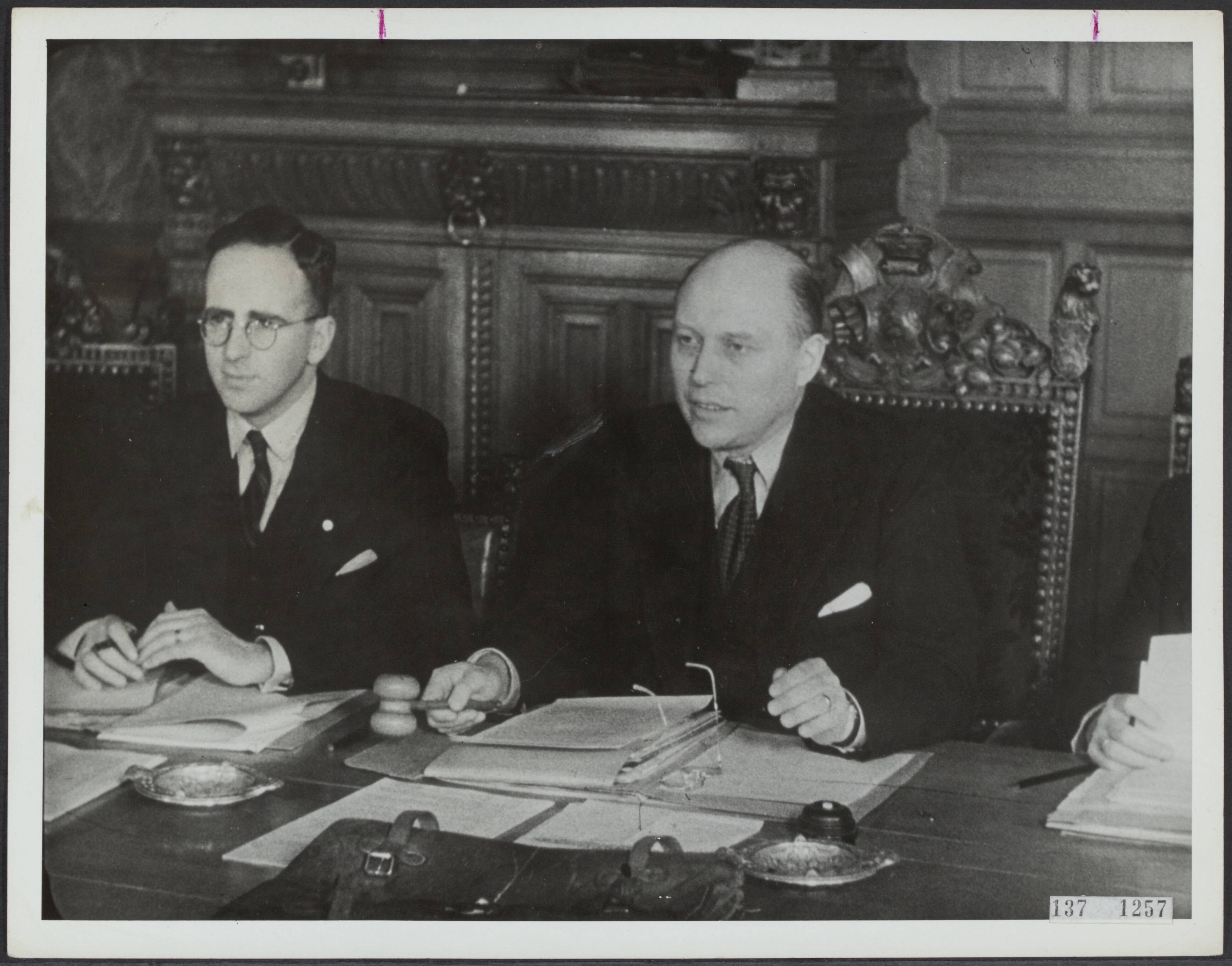 Kabinet Schermerhorn-Drees. Ministerraad. Minister-president Schermerhorn met links naast zich de secretaris van de Ministerraad P. Sanders