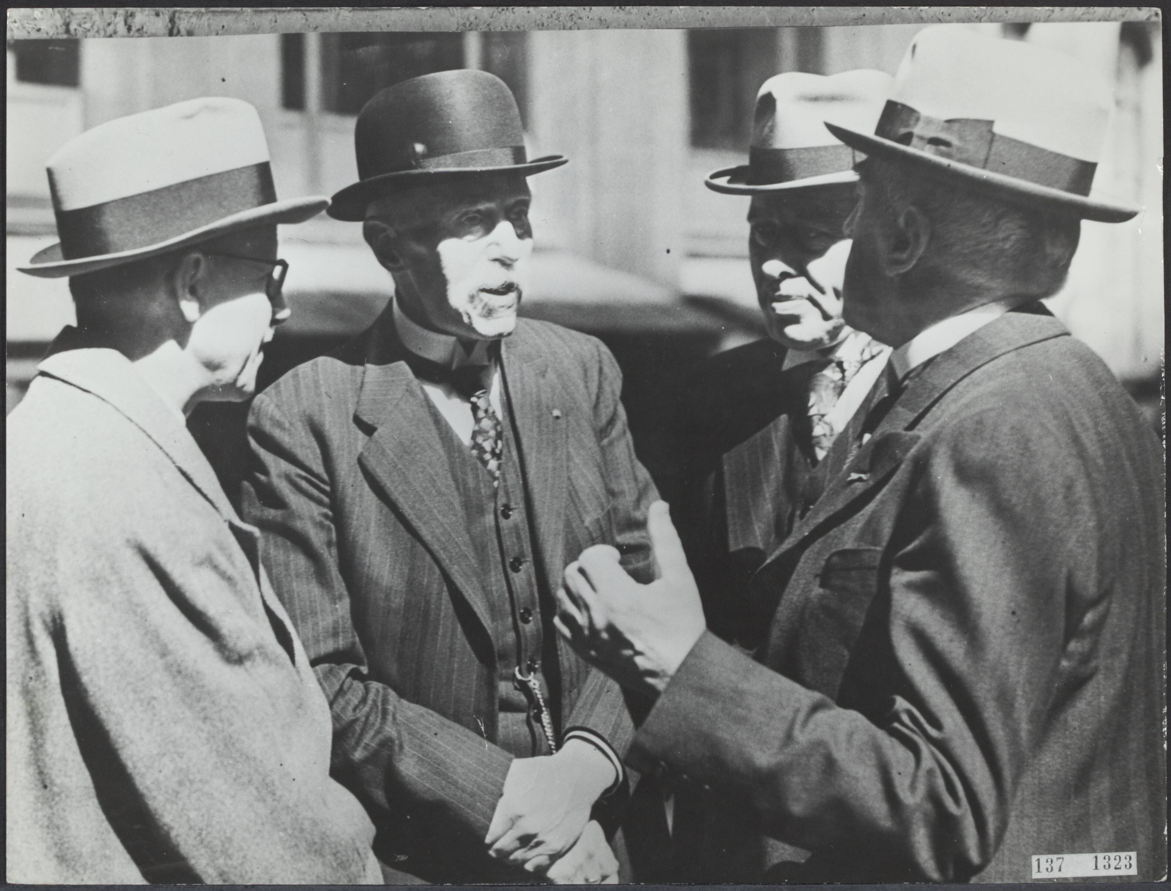 Ministers van het kabinet De Geer in gesprek bij de Nederlandse kerk Austin Friars te Londen. Vlnr. Secretaris-generaal A.M.C. Van Asch van Wijck?, D.J. de Geer, H. van Boeijen en G. Bolkestein