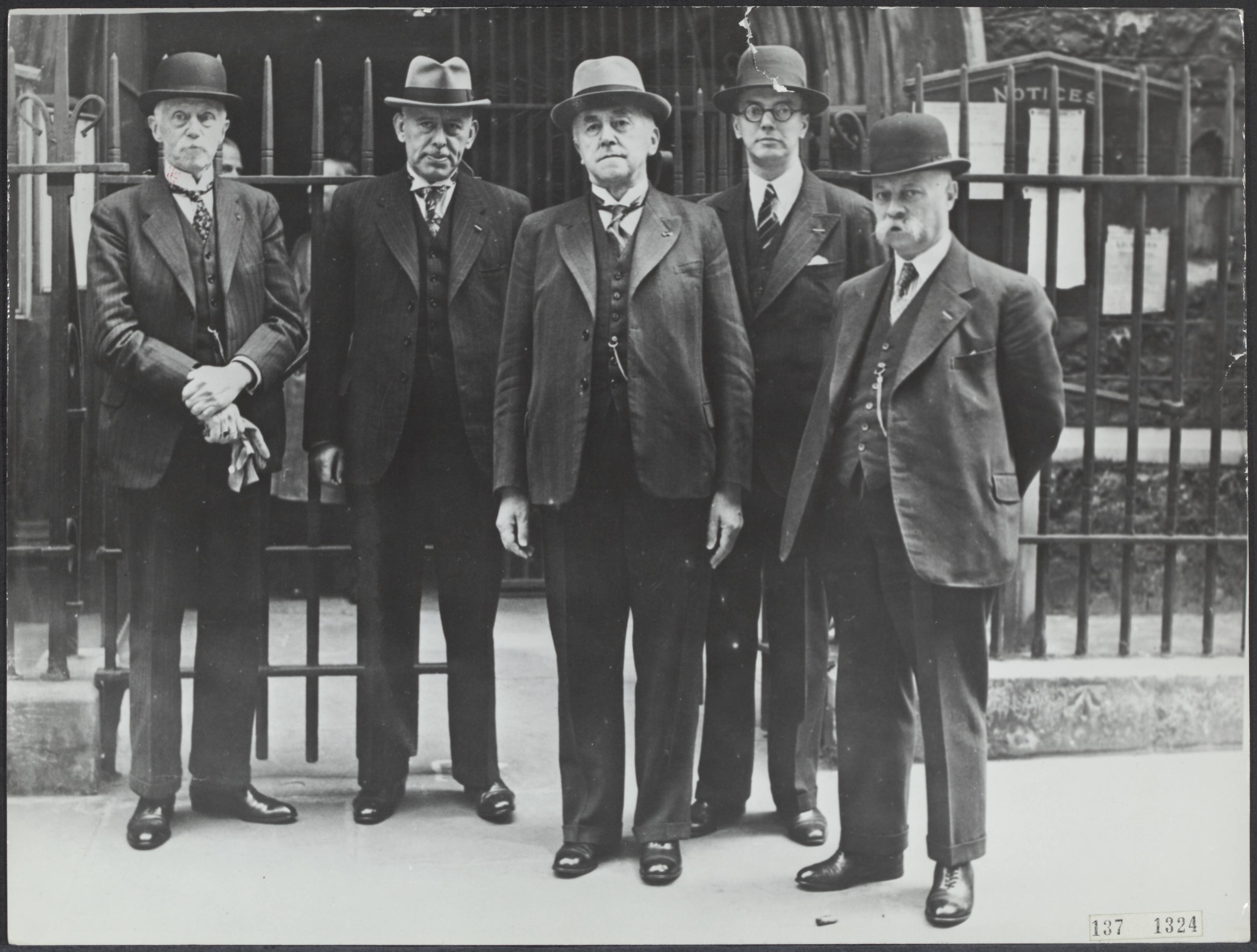 Ministers van het kabinet De Geer voor de Nederlandse kerk in Austin Friars te Londen. Vlnr. D.J. de Geer, H. van Boeijen, G. Bolkestein, A.A. van Rhijn en P.S. Gerbrandy