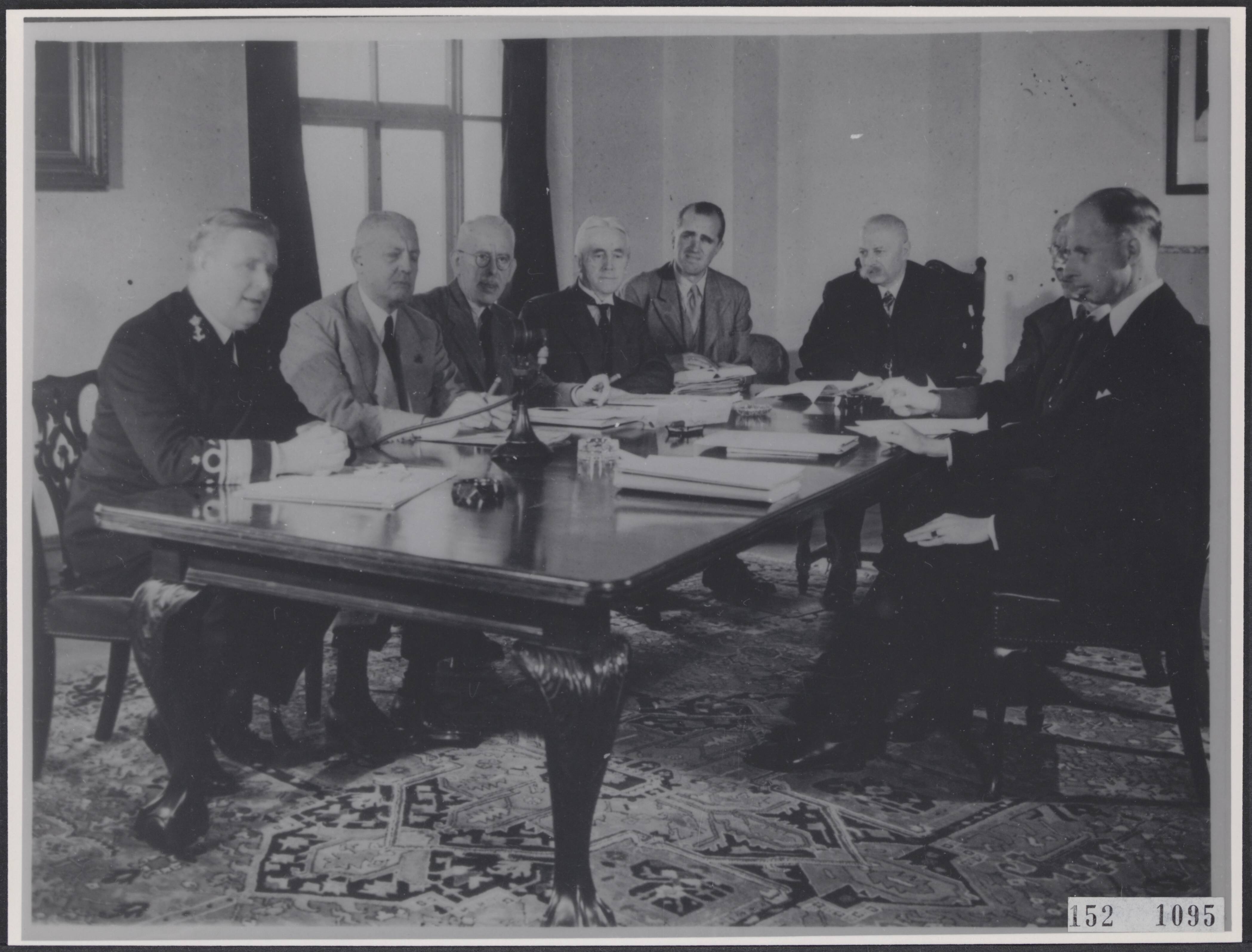 Nederlandse regering in Londen. Het Tweede Kabinet Gerbrandy tijdens eerste vergadering. Van links naar rechts: Furstner (Marine), Welter (Koloniën), Van Boeyen (Algemene Zaken), Bolkestein (Onderwijs), Steenberghe (Handel), Gerbrandy (premier), Albarda (Waterstaat), Van Kleffens (Buitenlandse Zaken).