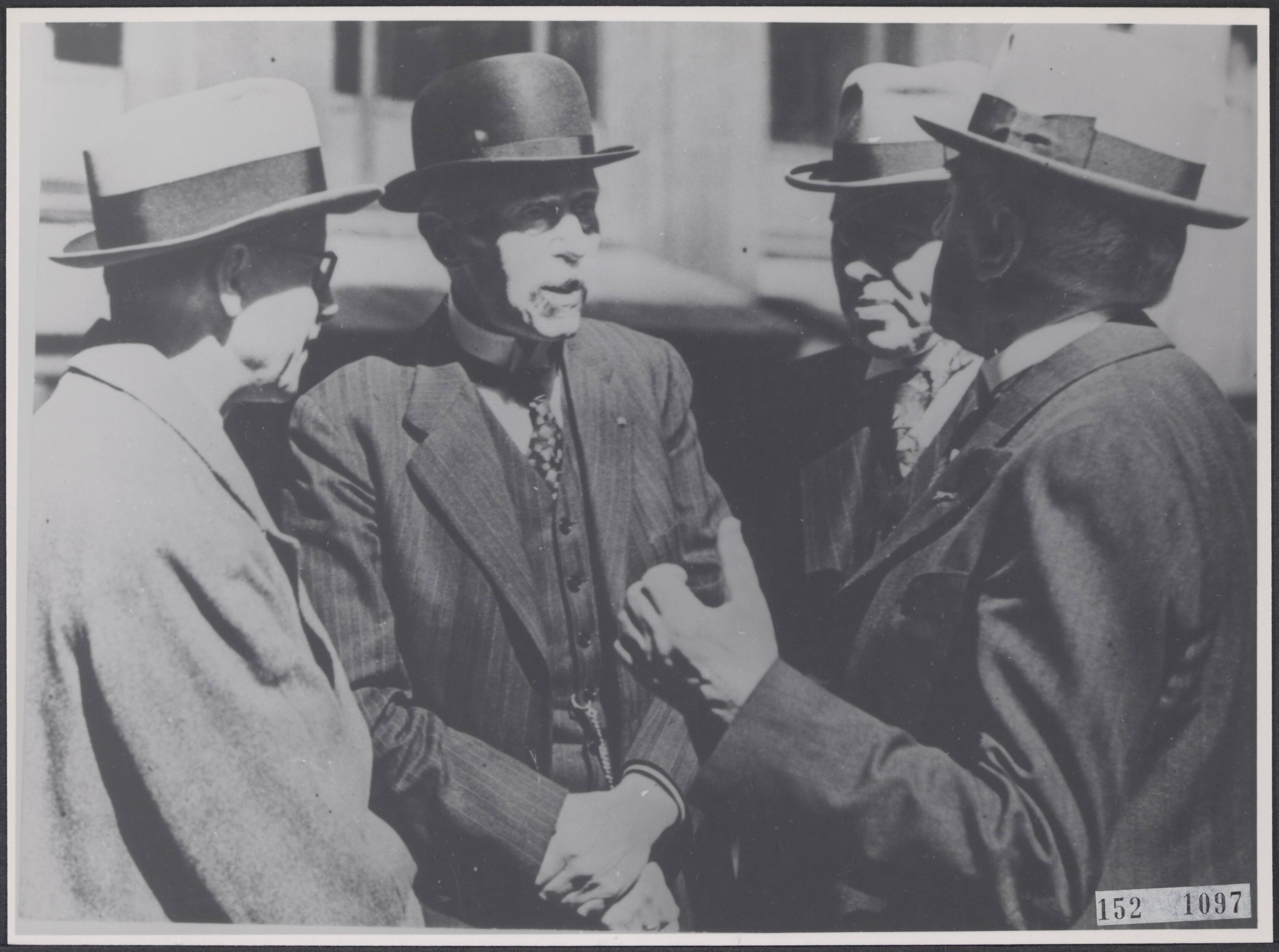 Ministers van het kabinet De Geer in gesprek bij de Nederlandse kerk Austin Friars te Londen. Vlnr. Secretaris-generaal A.M.C. Van Asch van Wijck?, D.J. de Geer, H. van Boeijen en G. Bolkestein