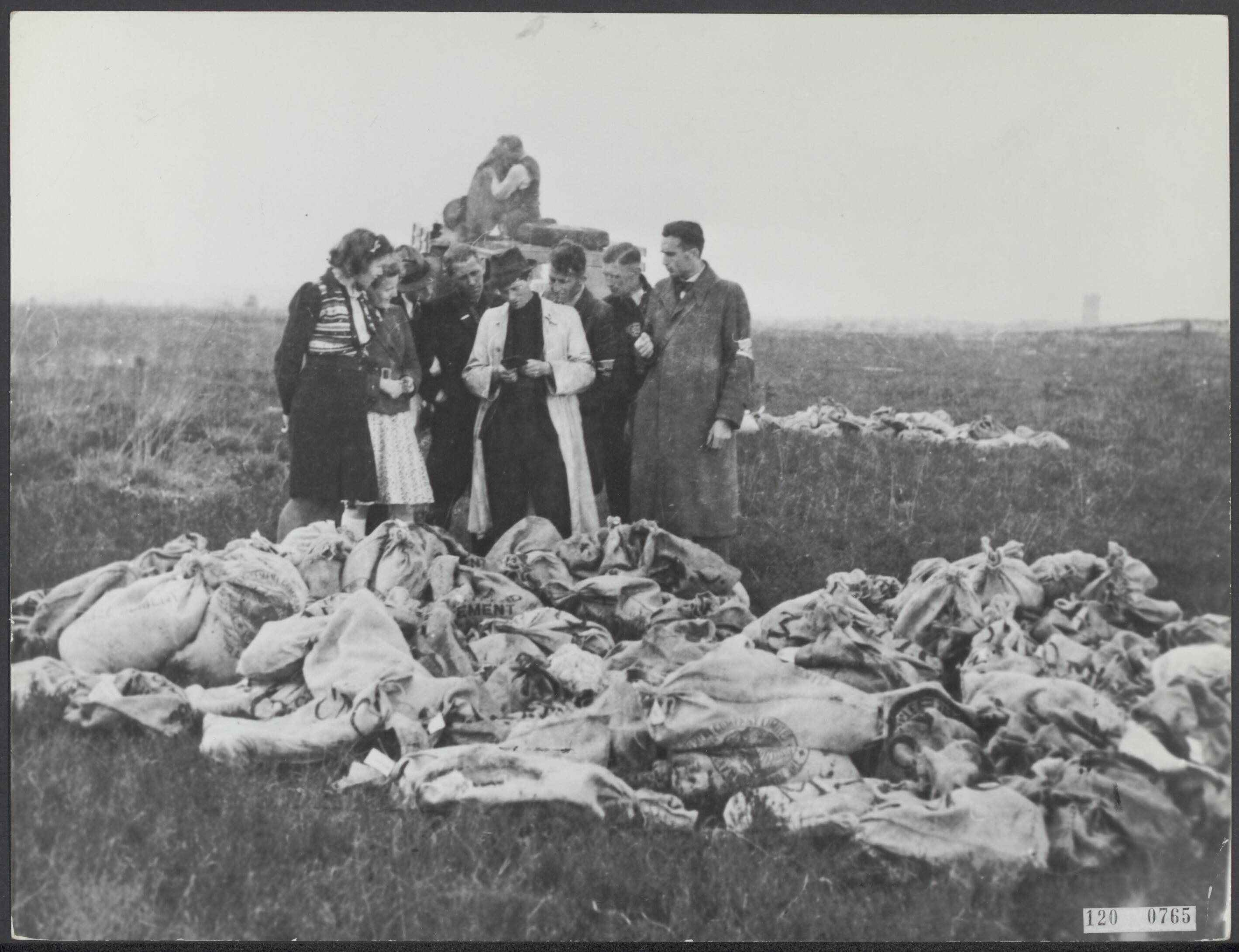 Voedseldropping April 1945 Groep mensen staat bij een stapel gedropte zakken