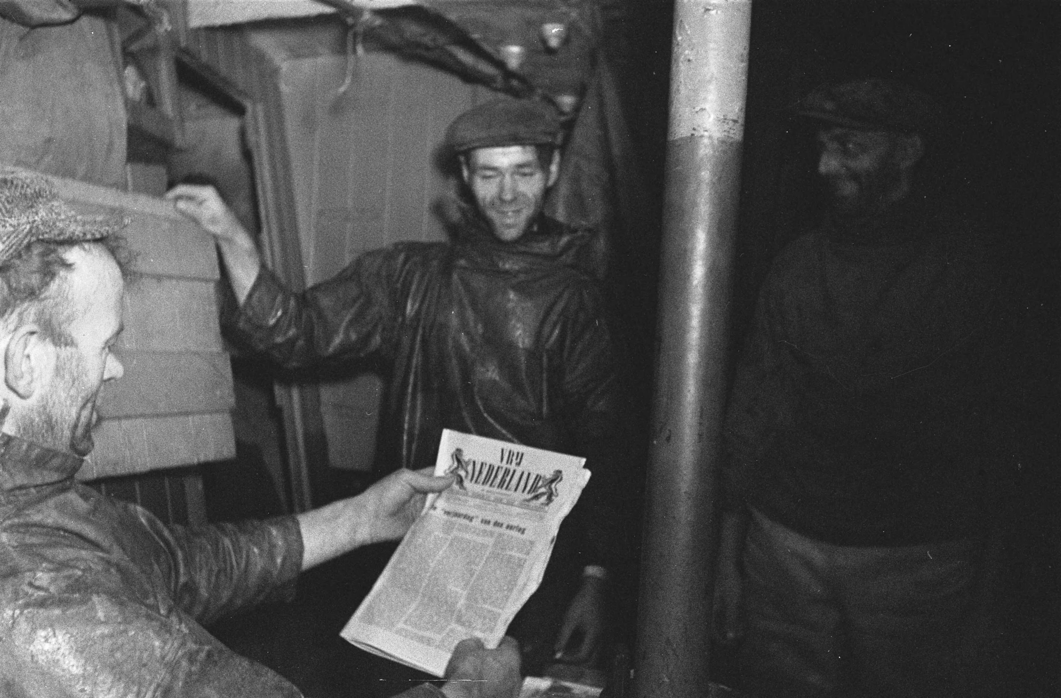 Aan boord van een Nederlandse vistrawler. Bemanning leest Vrij Nederland