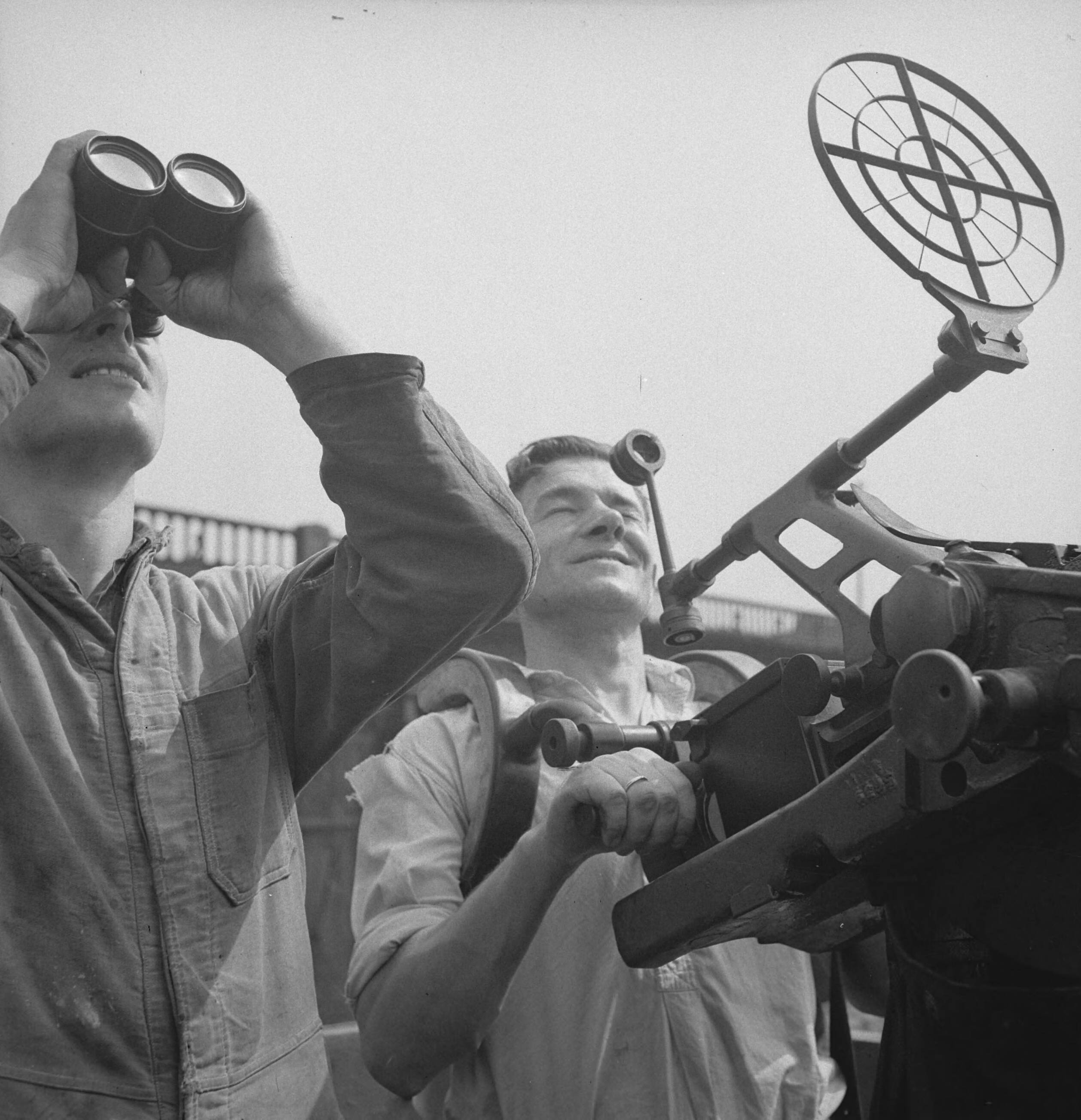 De kok bemant het afweergeschut op deze Nederlandse kustvaarder, nu in Groot-Brittannië