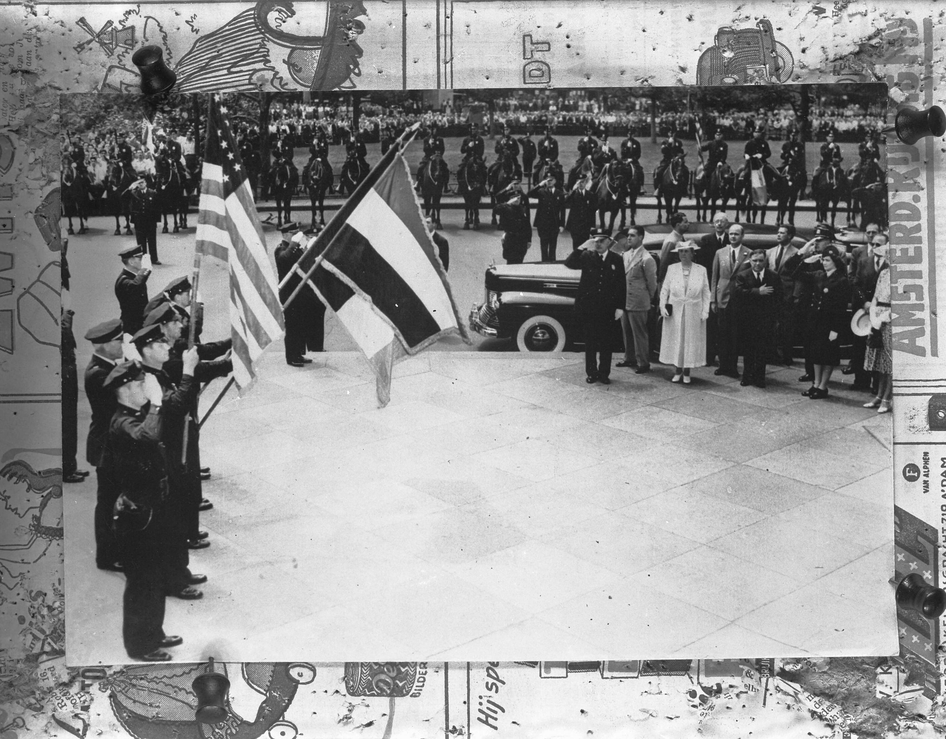 Koningin Wilhelmina brengt een bezoek aan New York en wordt verwelkomd door burgemeester La Guardia. Het spelen van de volksliederen