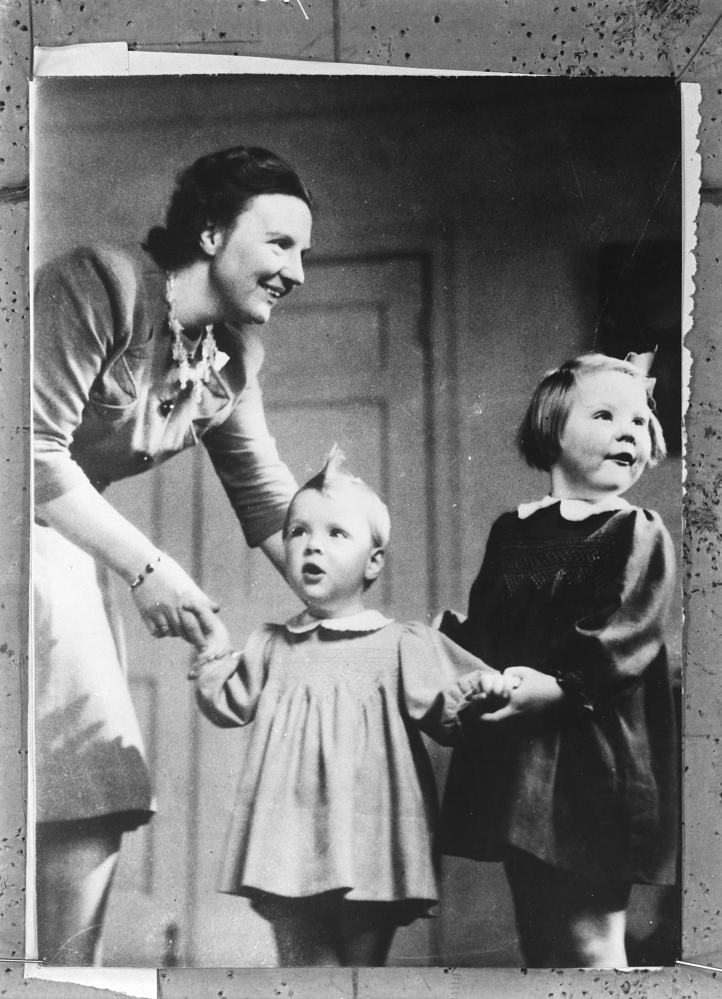 Prinses Juliana met prinses Beatrix (rechts 4 jaar) en prinses Irene (2 1/2 jaar) in hun huis in Ottawa (Canada)