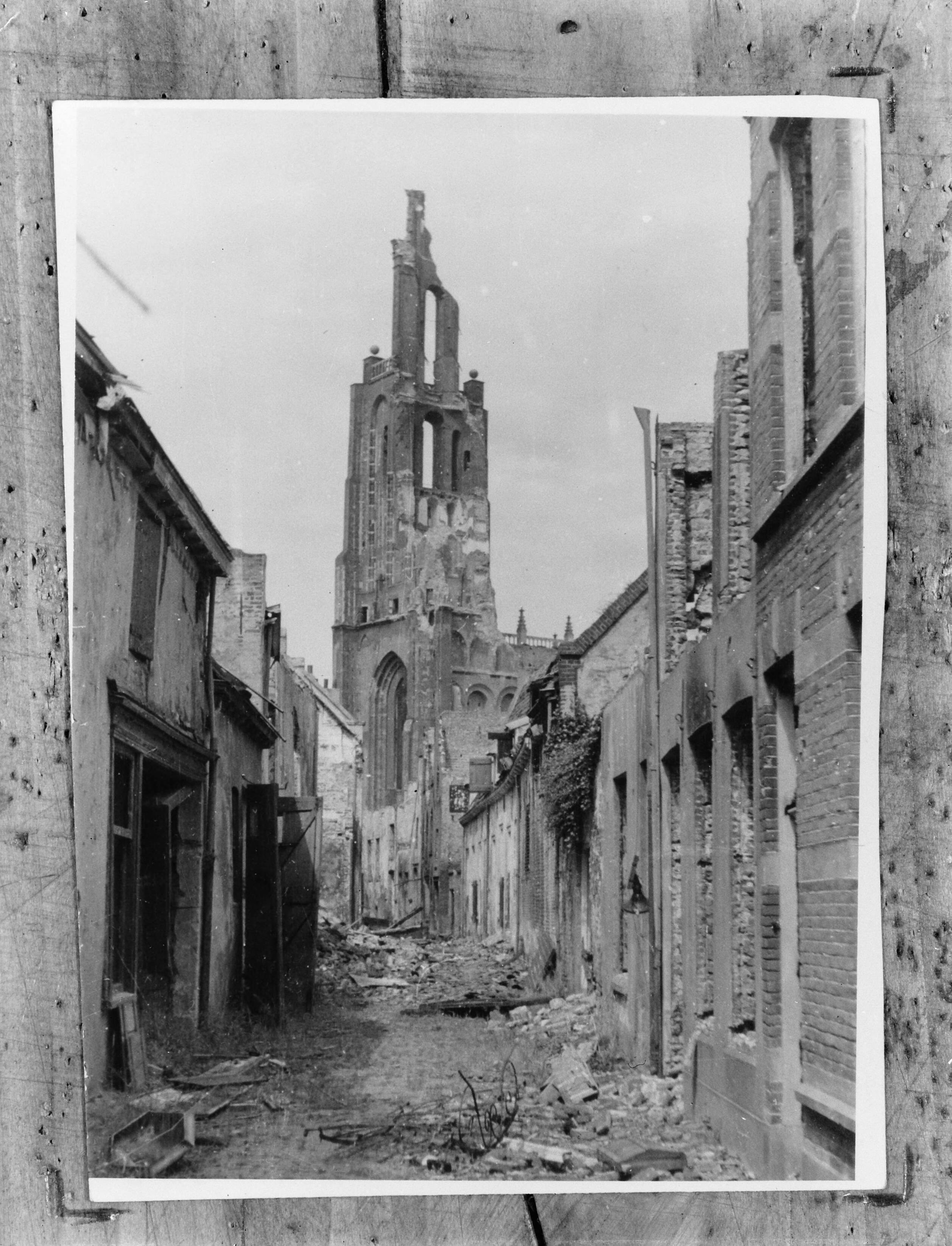 Verwoestingen te Arnhem. Toren van de Eusebiuskerk, gezien vanuit De Weerdjes (Trompetsteeg)