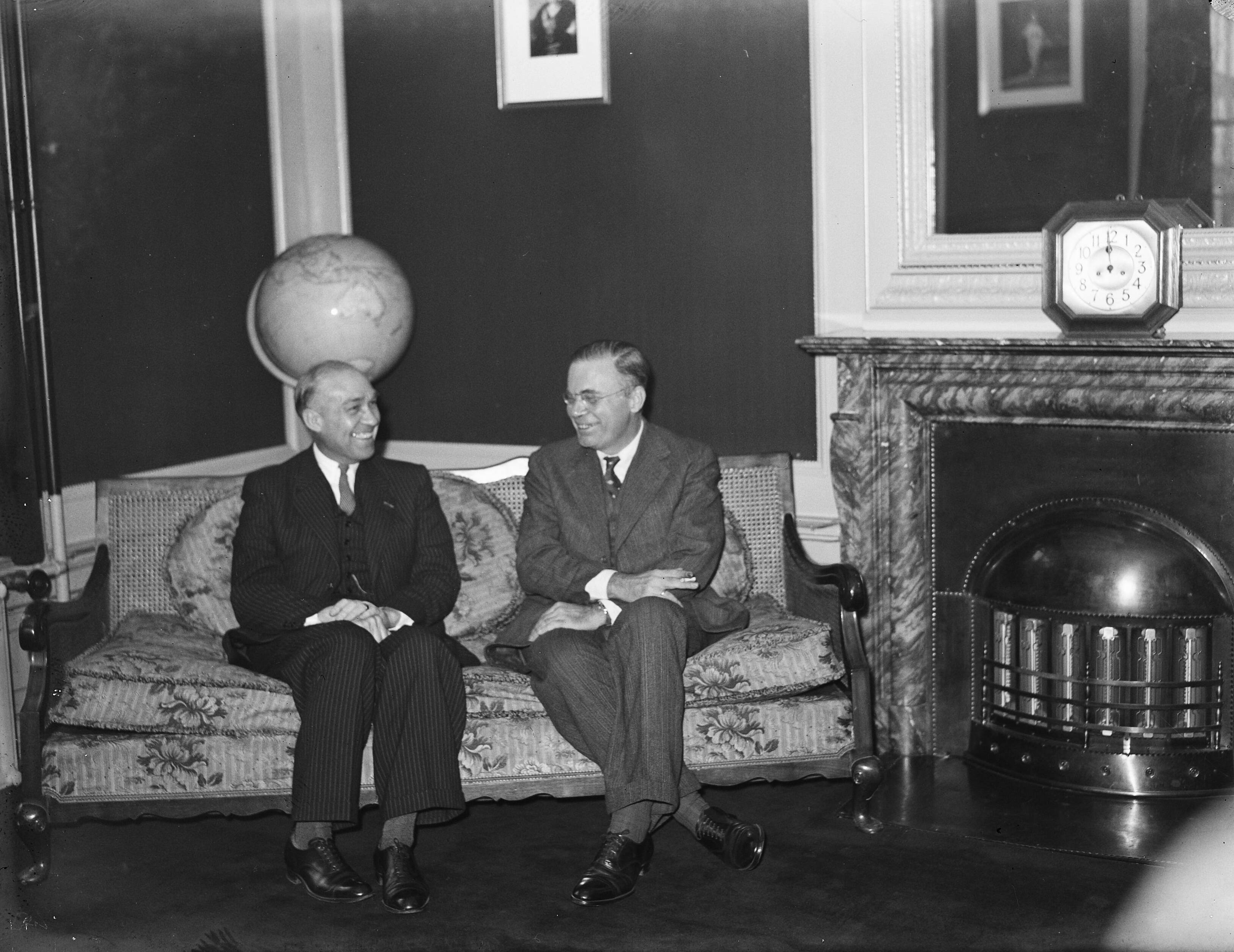Minister Logemann (links) en luitenant-gouverneur-generaal van Nederlands Indië, H.J. van Mook, die vanuit Indië is gearriveerd voor besprekingen