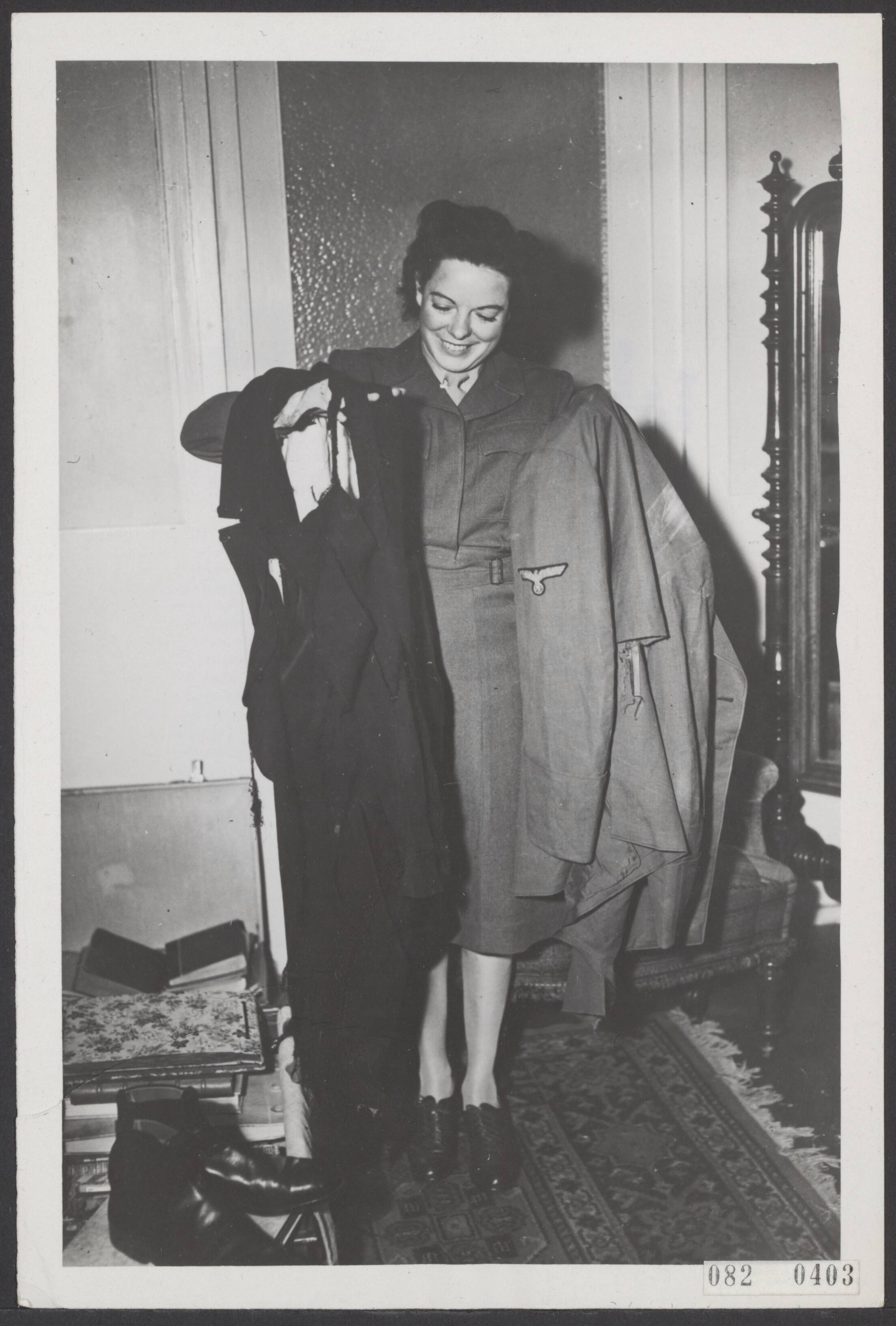 Door vrouwelijke leden van het Amerikaanse leger werd in een villa van Eva Braun in Beieren tussen haar kleding een kostuum van de "Führer" gevonden. Dit kostuum zou Adolf Hitler gedragen hebben tijdens de bomaanslag van 20 juli 1944, waarna hij het Eva Braun als souvenir ten geschenke gaf. Sergeant Wood met het kostuum