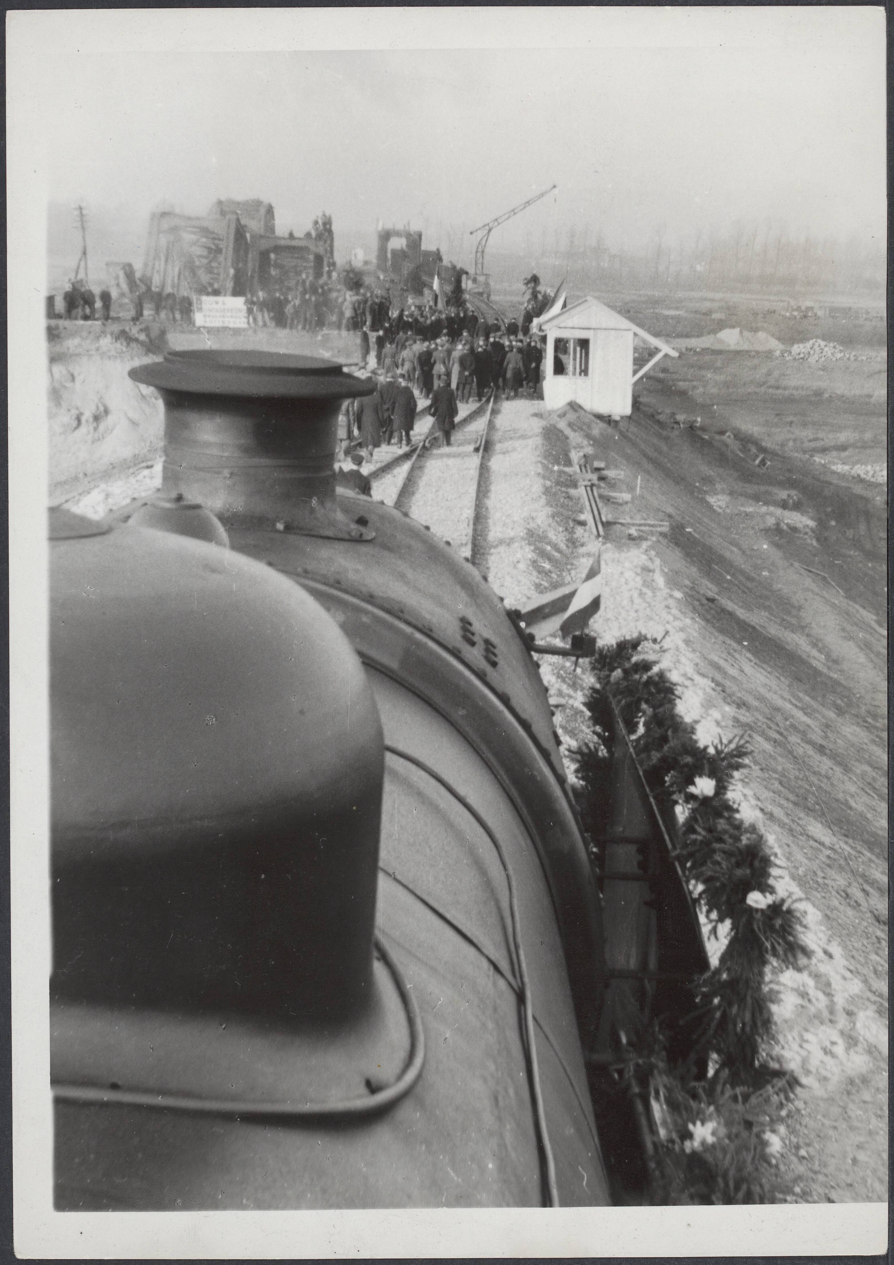 Reparatie van spoorbrug in Roermond. Na de schade die werd aangericht door zich terugtrekkende Duitse soldaten, wordt alles zo goed mogelijk gerepareerd. Hier nadert weer een trein tijdens de officiele openingsceremonie.