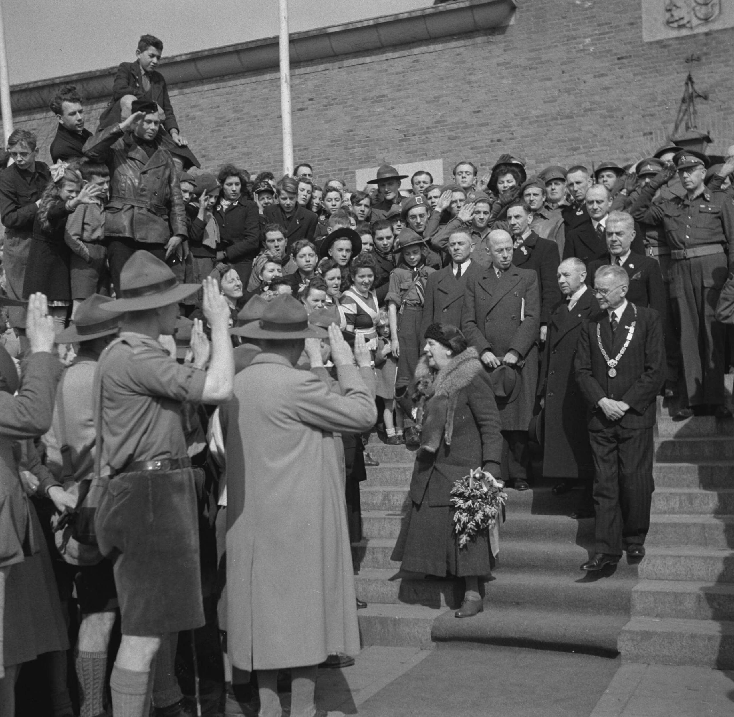 Koningin Wilhelmina tijdens bezoek en rondreis door bevrijd Zuid-Nederland. Bij het Van Abbe museum te Eindhoven