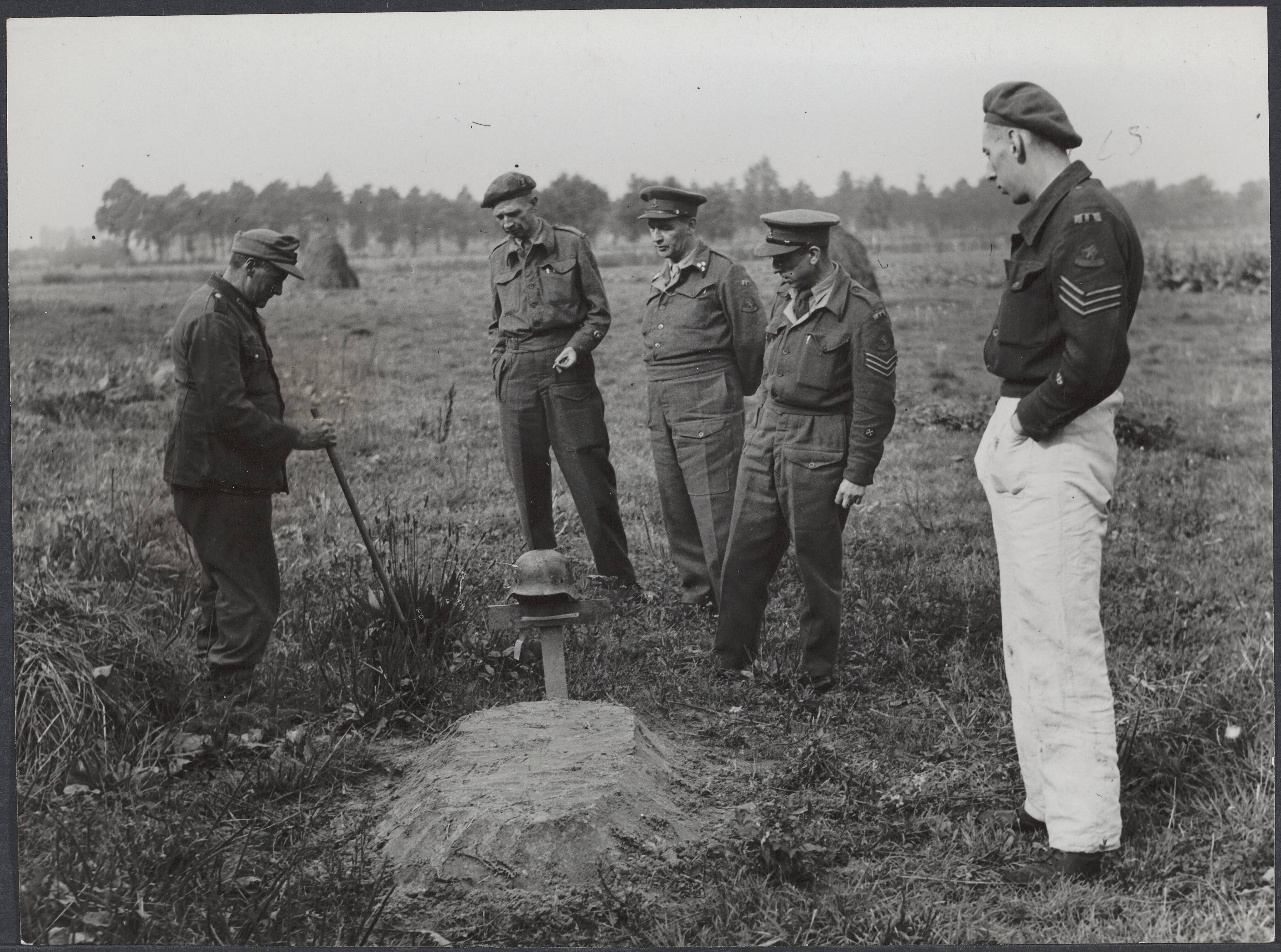 De dienst Identificatie en Berging olv dr. A. van Anrooy en dr. A.H. Croes, graven de lichamen op van mensen die stierven door een bombardement door de Duitsers op Eindhoven, en die haastig begraven waren langs de wegen of in weilanden. Daarna werden de r