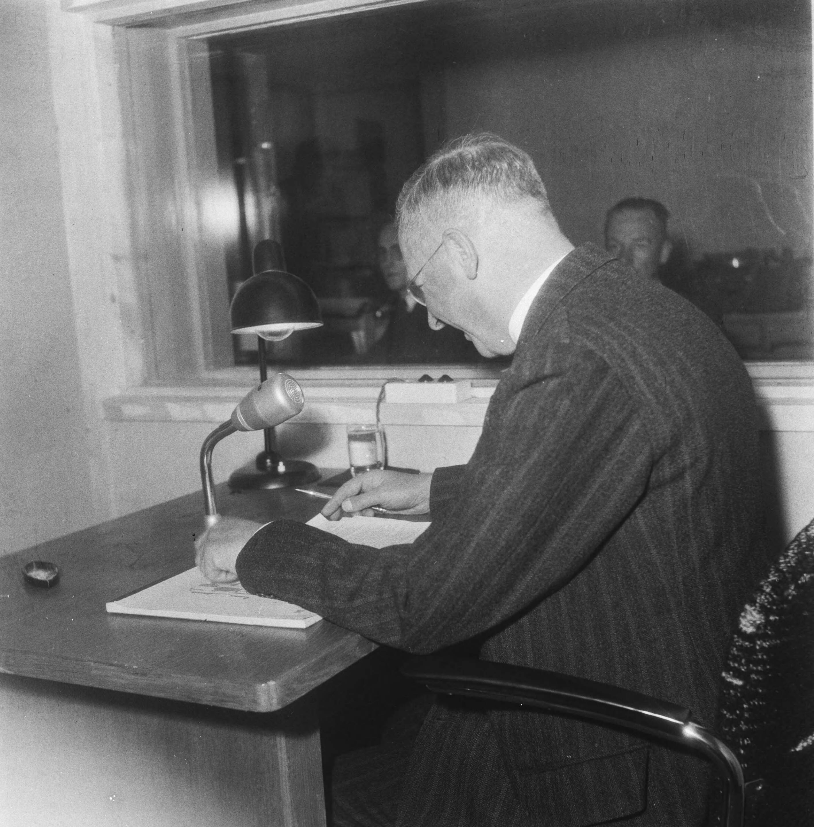 Minister van Financiën Piet Lieftinck in een radiostudio tijdens een radiorede