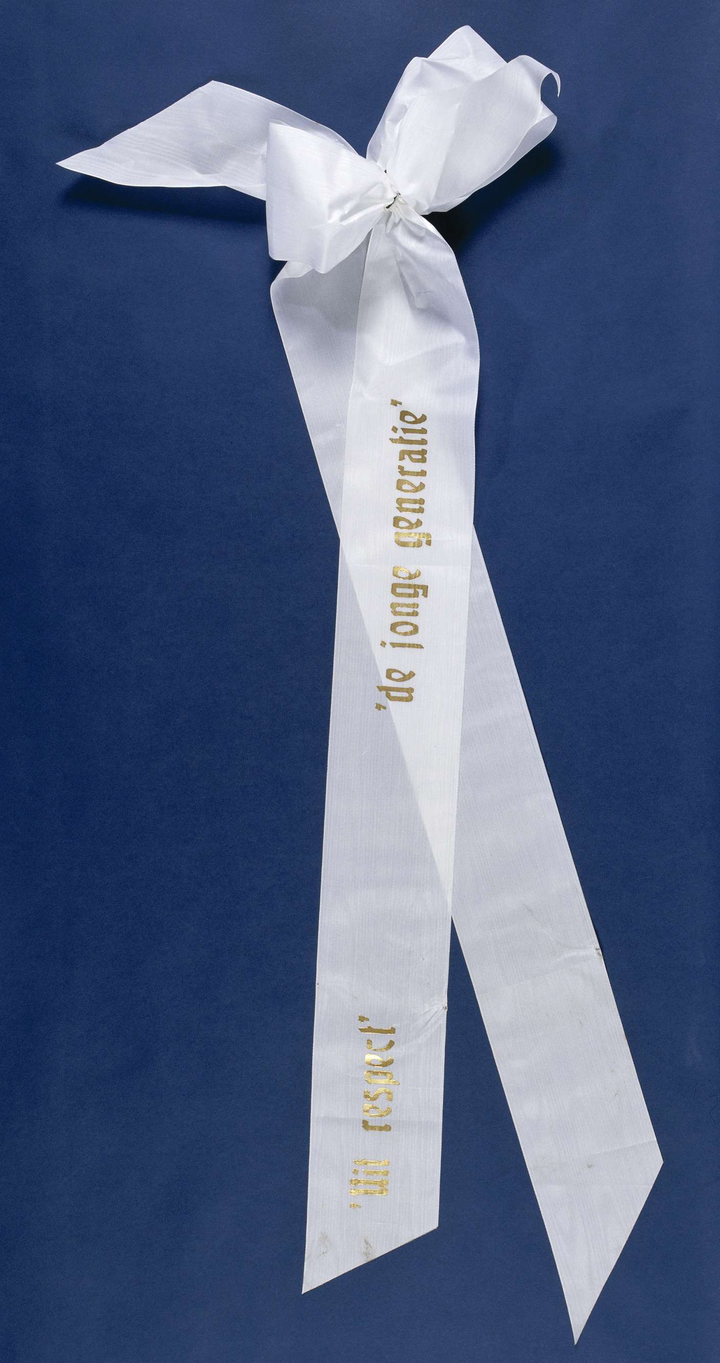 Twee bij elkaar horende witte linten, gelegd op 4 mei 2000 bij het Nationaal Monument op de Dam. Het ene lint is v.z.v. een gouden opdruk, de andere is blanco. Linten zijn aan de uiteinden schuin afgeknipt. Aan een zijde tot strik gebonden met ijzerdraad. IJzerdraad gebogen t.b.v. bevestiging aan krans.