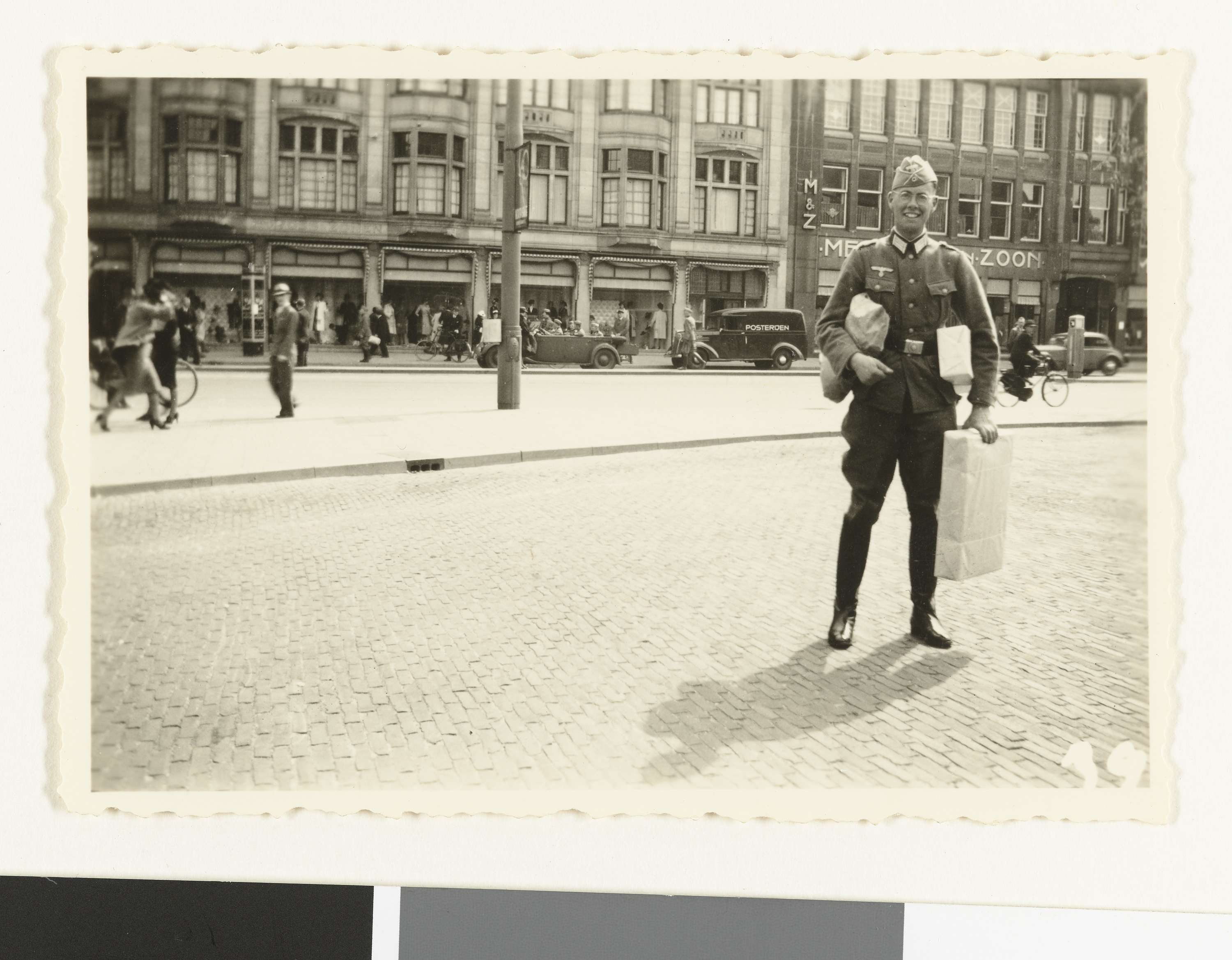 Een Duitse soldaat, met legerpet en bril, staat midden op de Hofweg (tegenover het Binnenhof) in Den Haag met drie pakjes. Achter hem huizen en winkels, o.a. Meddens en Zoon en voetgangers. Het lijkt weer dezelfde persoon als op de nrs. NG-2007-5-35 t/m38