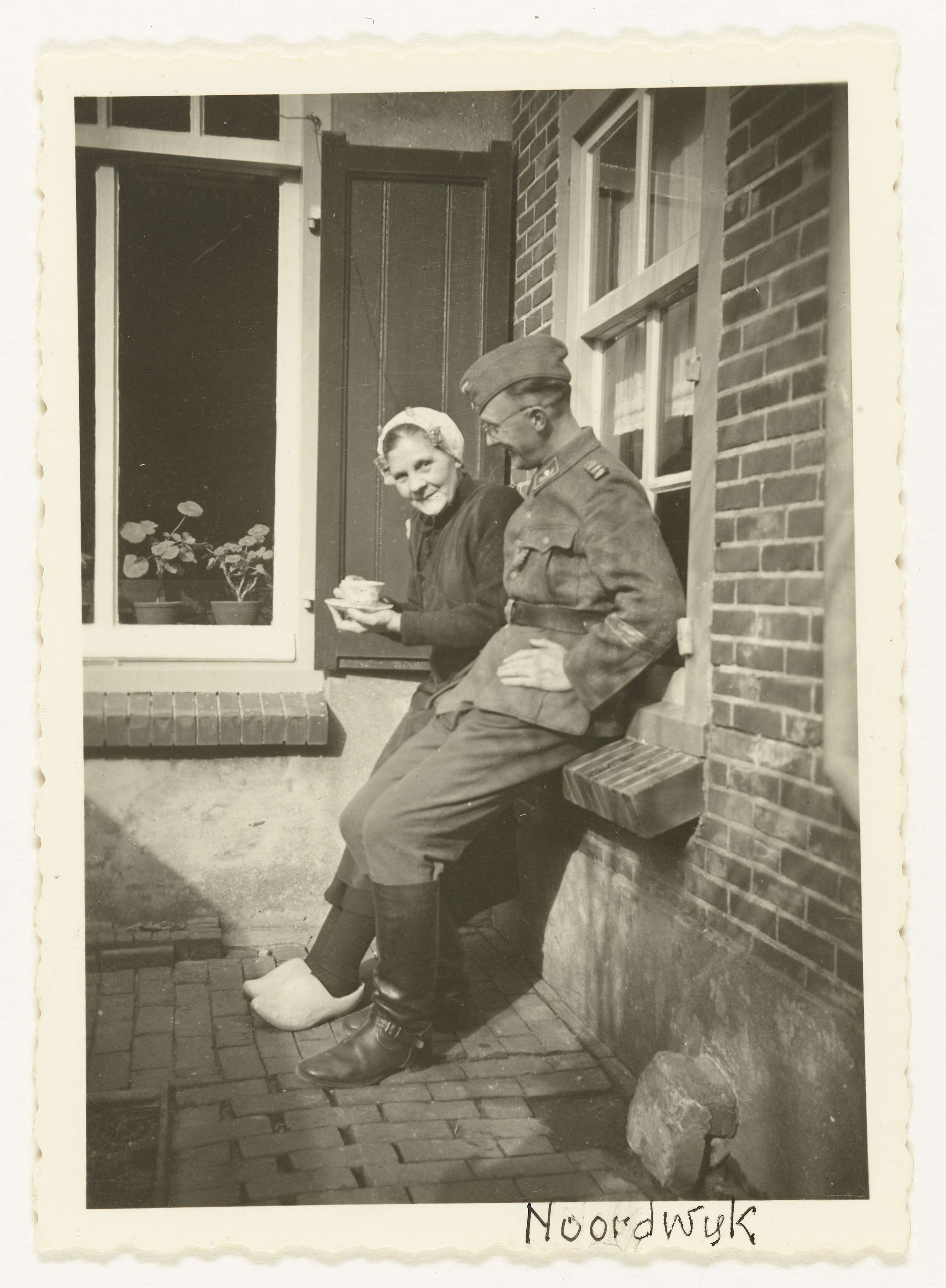 Een Duitse militair leunt op een vensterbank en kijkt naar een oudere vrouw links van hem die een kopje koffie vast houdt en in de camera kijkt. De vrouw heeft een kapje met oorijzers op haar hoofd en klompen aan. Achter het raam staan geraniums. In Noordwijk.