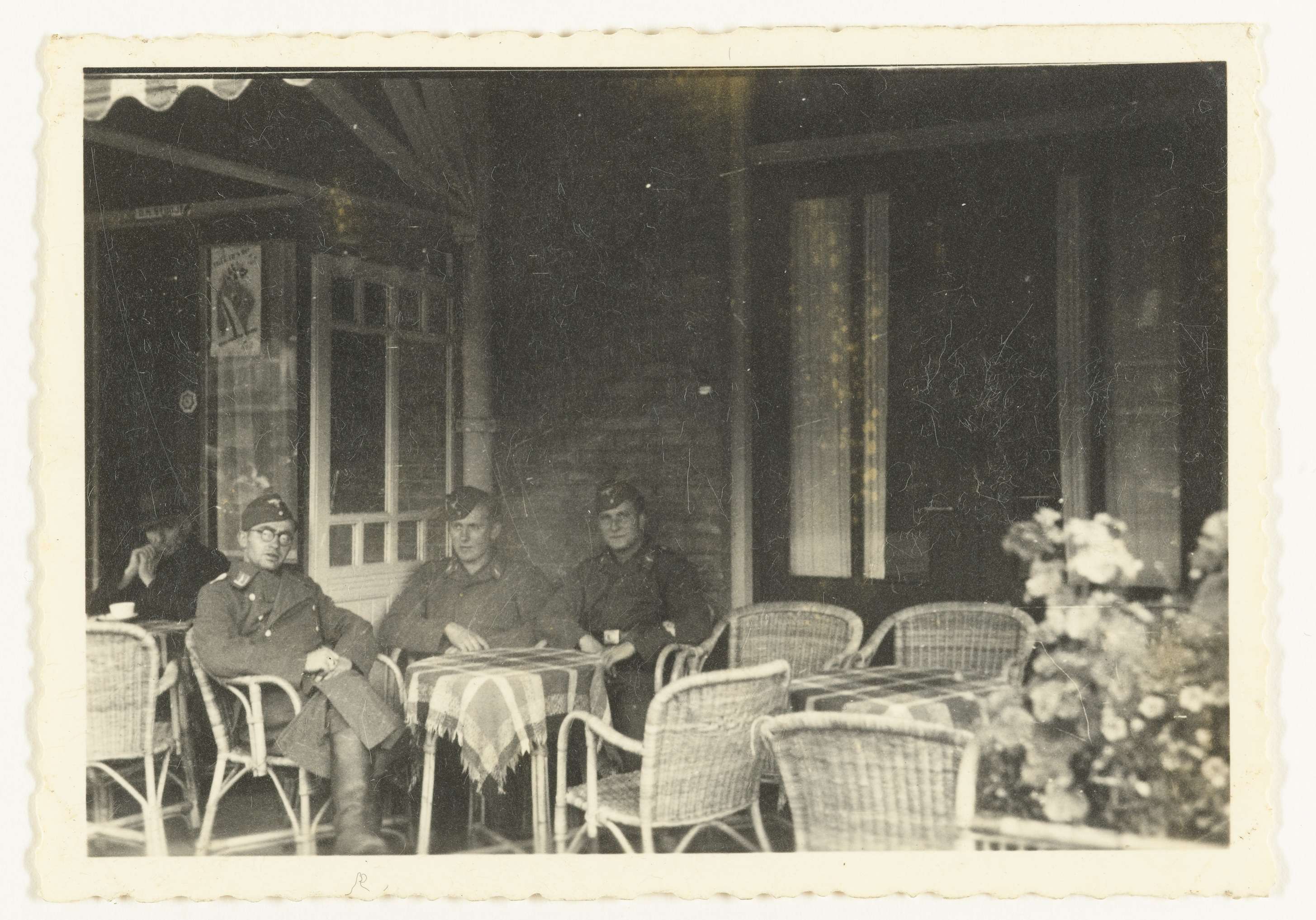 Drie Wehrmacht soldaten zitten op een terras met rieten stoelen. Achterop staat: onleesbaar.