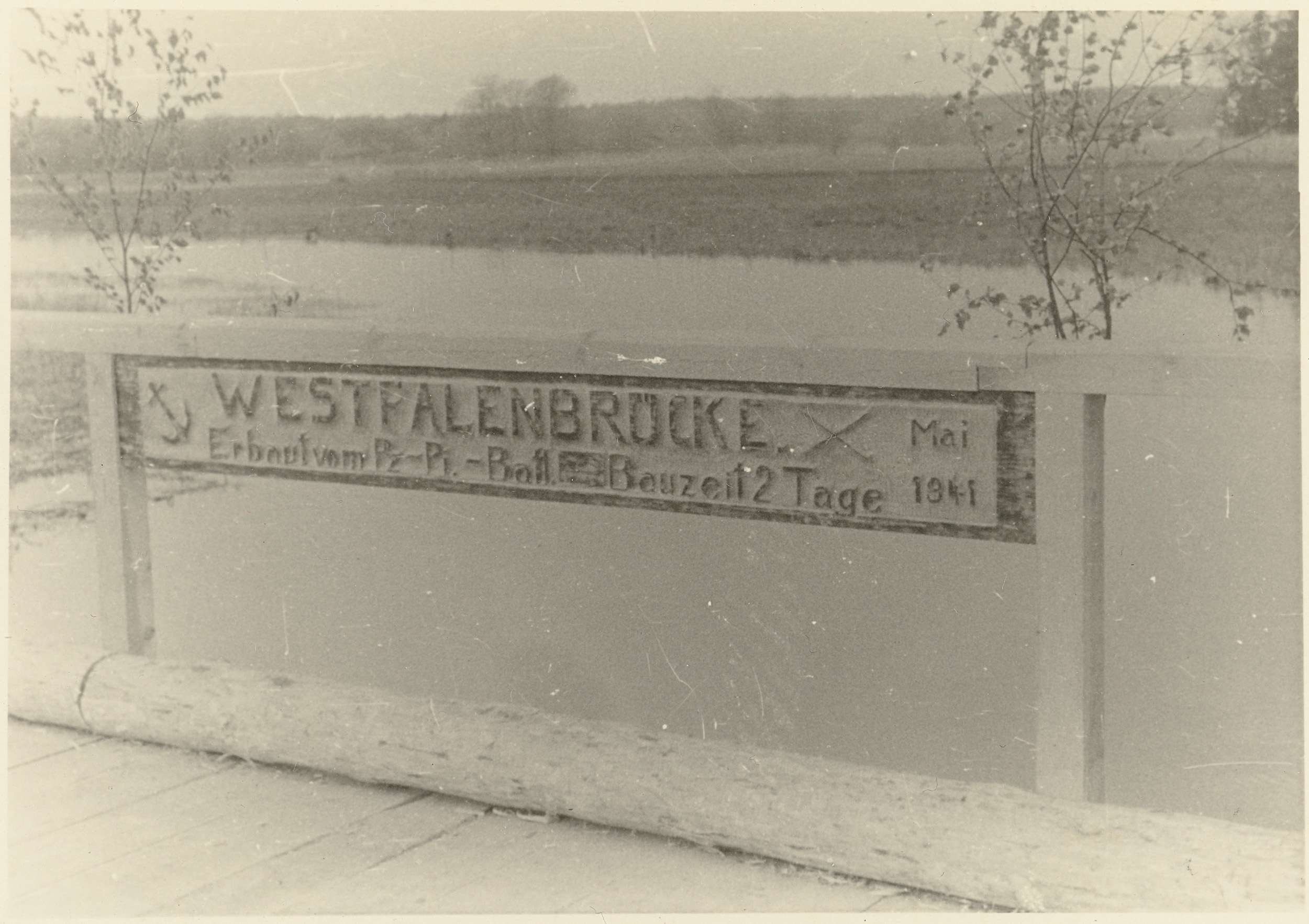 Een houten brug met een bord met de tekst dat deze brug in twee dagen gebouwd is, Westfalenbrücke. Foto behorend bij album 'Kriegserinnerungen'.