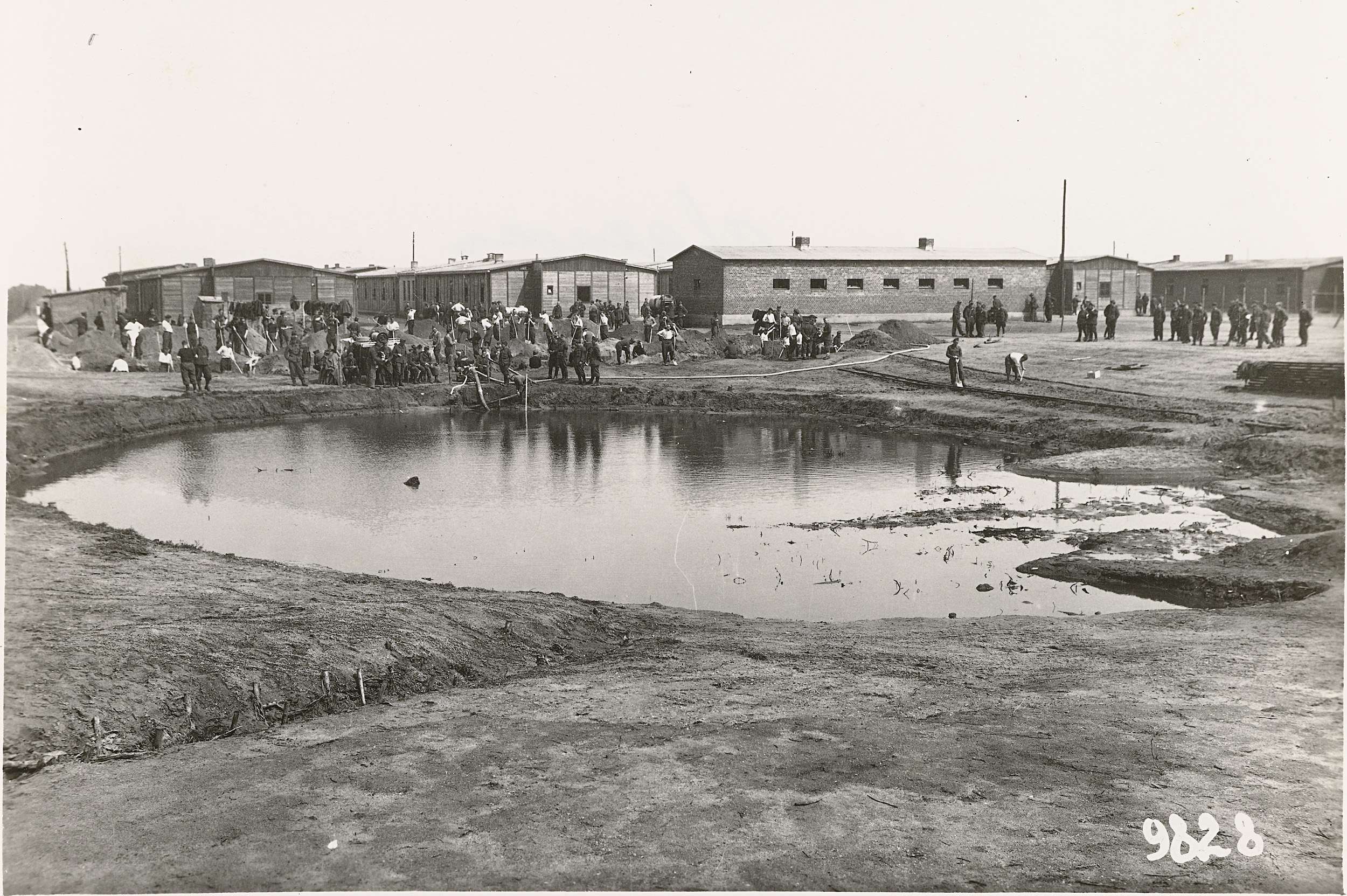 Het graven van een vijver als waterreservoir voor de brandweer, tevens gebruikt als zwembad voor de recreatie van de gevangenen. Onderdeel van een groep van 130 foto's gemaakt door Dick van Maarseveen in het Duitse krijgsgevangenenkamp Stalag IV B in Mühlberg in de periode 1943-1945.