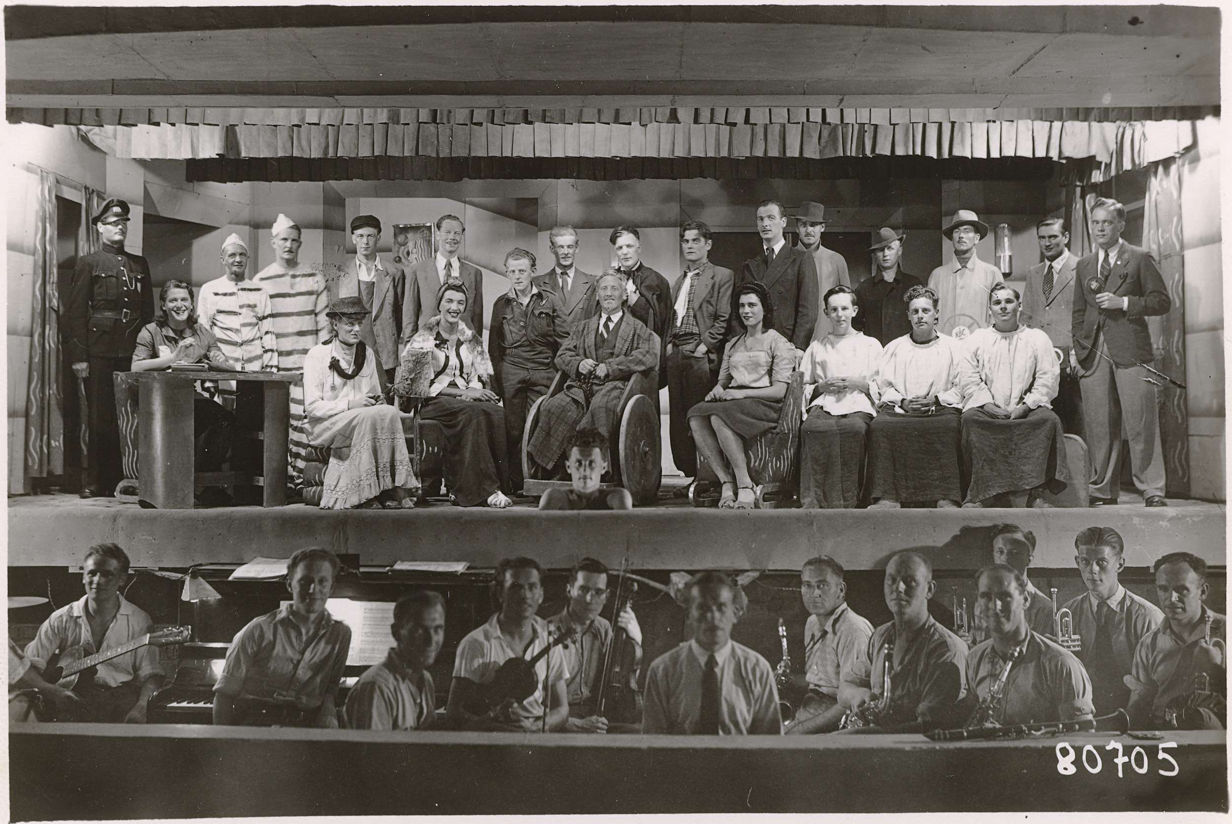 Uitvoering door een toneelgezelschap en een orkest van krijgsgevangenen in Kamp Mühlberg. Onderdeel van een groep foto's gemaakt door Dick van Maarseveen in het Duitse krijgsgevangenenkamp Stalag IV B in Mühlberg in de periode 1943-1945.