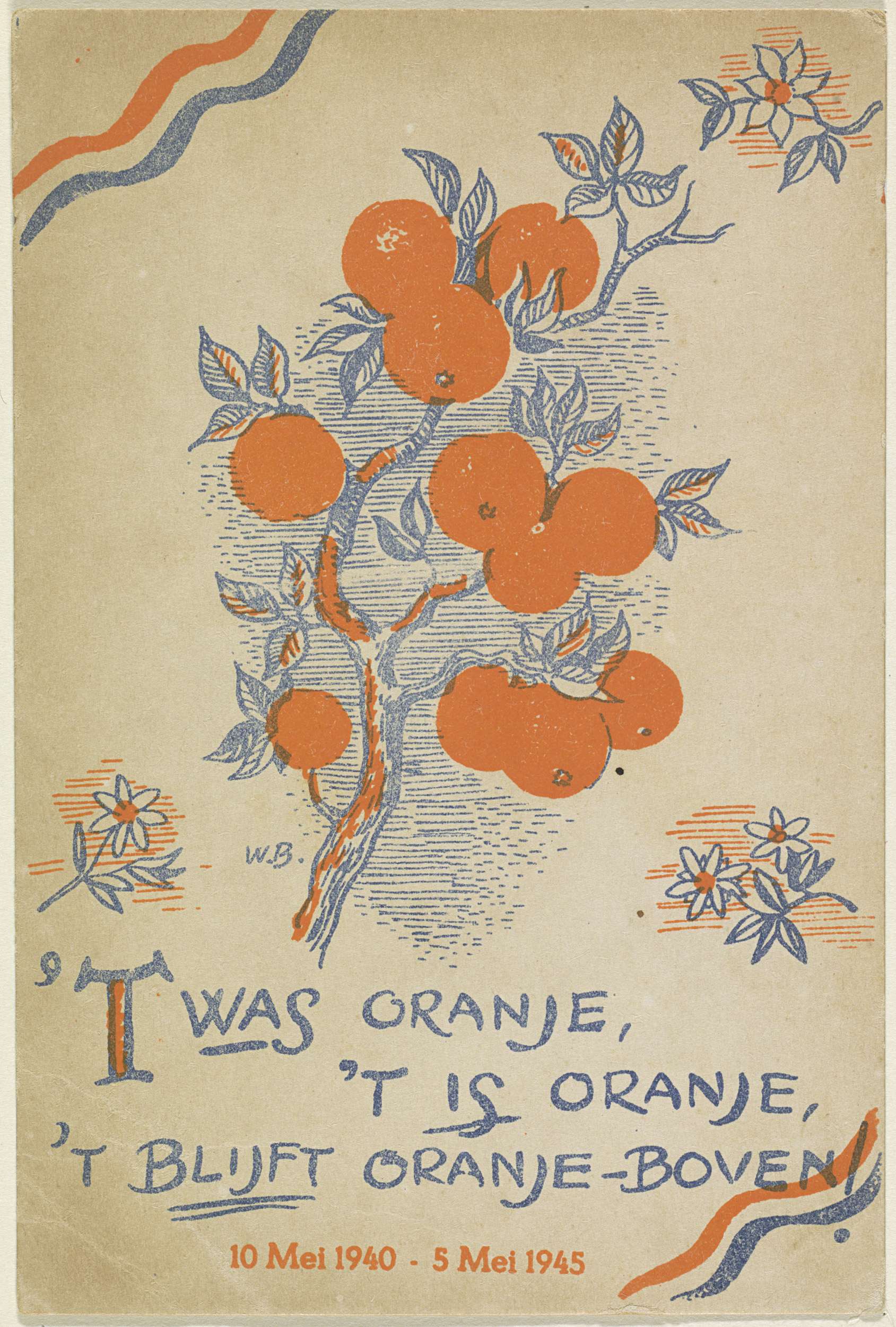 Feestplaat ter ere van de bevrijding van Nederland op 5 mei 1945. In het midden een oranjetak met bladeren en vruchten. Daar omheen bloesem van een oranjeboom en linten met de Nederlandse vlag. Eronder drie regels Nederlandse tekst en de data '10 Mei 1940-5 Mei 1945'.