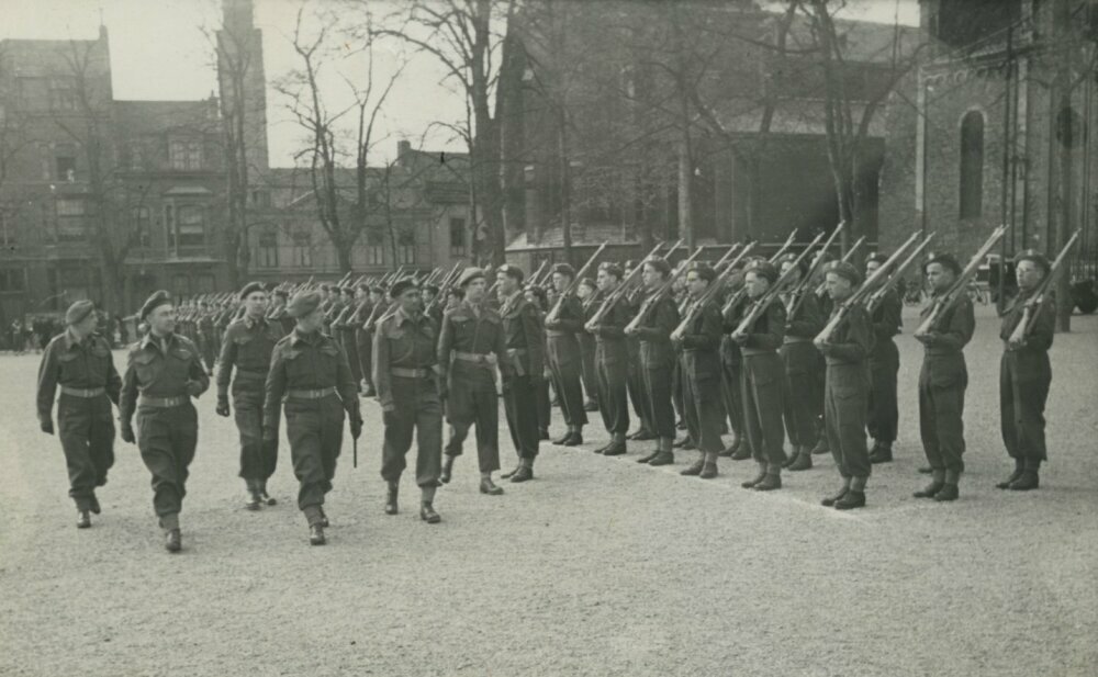 Inspectie van de militairen van het 8e (4e) Bataljon Regiment Stoottroepen, voorafgaand aan de inzet in Nederlands-Indië, door de regimentscommandant luitenant-kolonel Bep van Kooten.