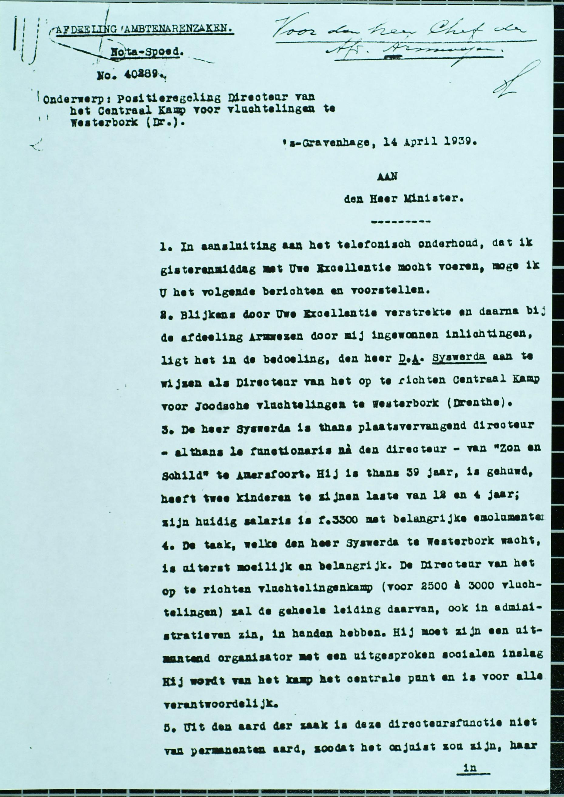 Nota van de chef van de afdeling aan de chef van de afdeling Ambtenarenzaken inzake de wenselijkheid tot het aangaan van...