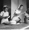Een groep meisjes staan in een huishoudschool te Jakarta rondom een pianospelende leerling te zingen, Indonesië (1947)
