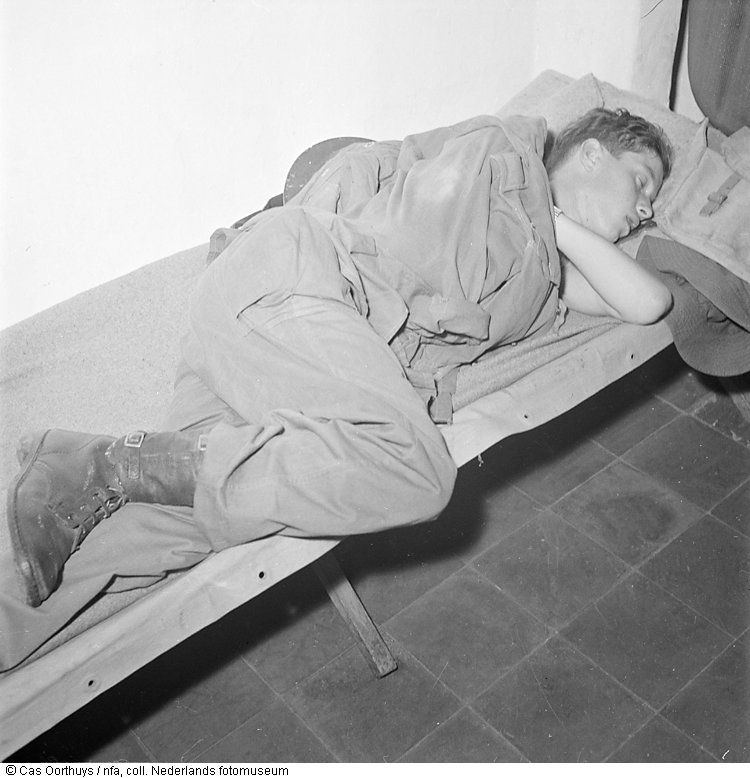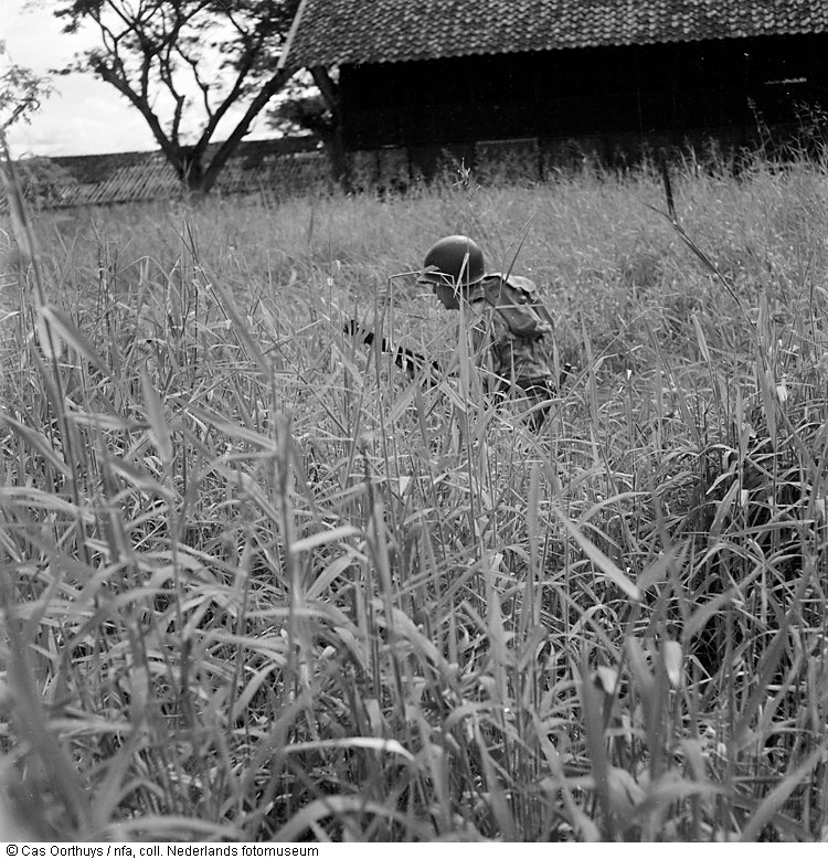 Nederlandse militair leest in bivak een brief op zijn brits, Indonesië (1947)