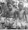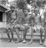 Zieke en ondervoede kinderen zitten op een bankje te wachten op behandeling, Indonesië (1947)