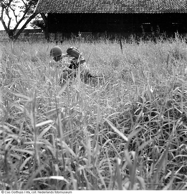 Nederlandse militair zoekt dekking in het veld, Indonesië (1947)