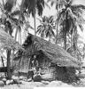 Een vrouw en drie kinderen zitten vóór een inheemse woning op West-Java, Indonesië (z.j.)