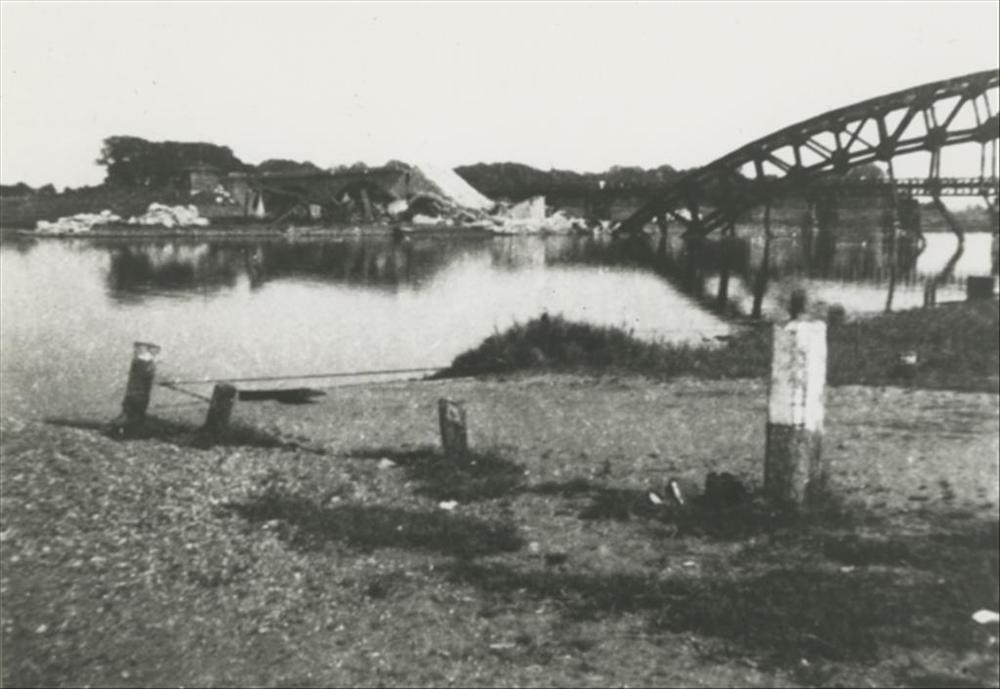 De veerpont over de Maas; op de achtergrond de verwoeste verkeersbrug opgeblazen door het Nederlandse leger om de Duitse opmars te stuiten.