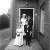 Huwelijk Th. v.d. Meerendonk-Smits. Bruidspaar met bruidsmeisjes en bruidsjonker.