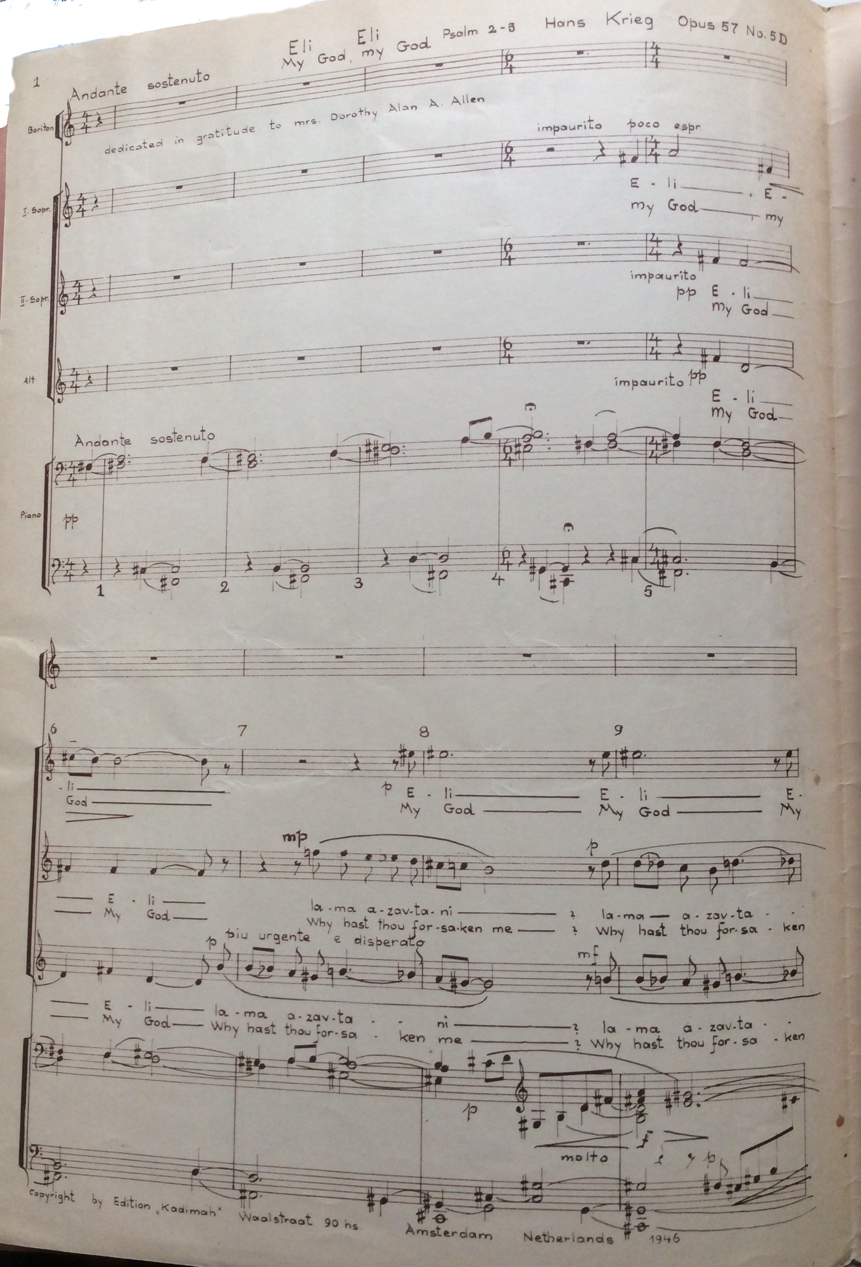 Arrangement by Hans Krieg The life of Hans Krieg, a German who became a Dutch citizen in 1951, was marked by the horrors of Nazi ideology. Before the war, a promising career as a composer and choral and opera conductor was on the horizon, however, when Hitler and the Nazi Party came to power, Krieg, as a persona non grata had to flee his homeland. He managed to establish a new life in the Netherlands, but after the war he had to rebuild his life. Once more he succeeded, and this humble man was recognized as a key figure in the Jewish community. by Aagje Pabbruwe