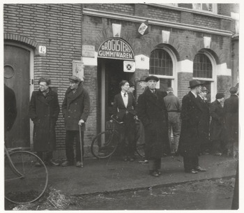 Zwarte handel vóór de deur van banketbakkerij Landman, Nieuwendijk 142. Rechts nummer 140 en links 144 (ged.)