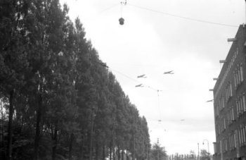 Geallieerde vliegtuigen boven het Stadionplein, vermoedelijk in verband met de voedseldroppings boven Schiphol