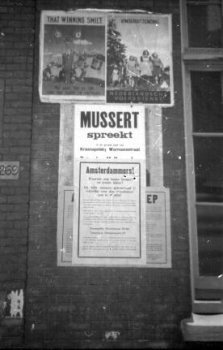 Links een pamflet van de NSB dat deel uitmaakt van de hetzecampagne van die partij tegen de hispanist en lector aan de Universiteit van Amsterdam, J. Brouwer, rechts propaganda van het NVV. Linksonder een bordje 'Voor Joden verboden'.