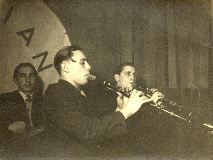 Johan Ribbink met zelfgemaakte elektrische gitaar en jasje van konijnenbont.