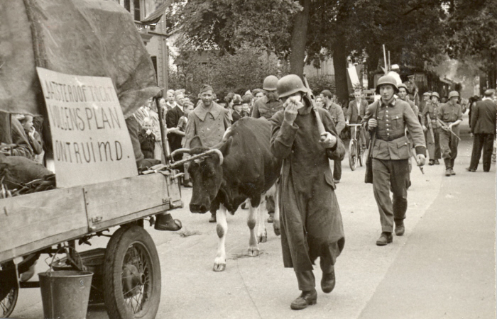 Bevrijdingsoptocht, "gevorderde" autobus van de VAD, met verklede Duitse soldaat.