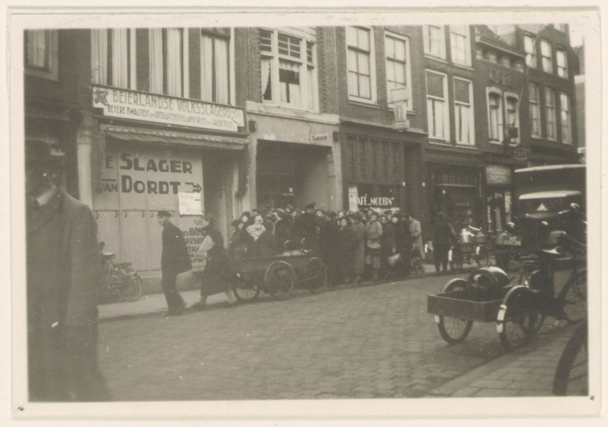 Het vlees wordt schaars. "Nieuwe orde, lege borde(n)". File voor de slagerij aan de Voorstraat.